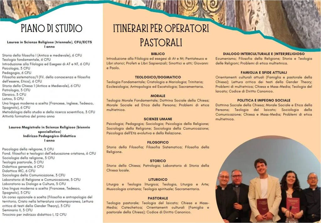 Il percorso di studi prevede un triennio per il conseguimento della Laurea in Scienze Religiose, e un biennio specialistico con indirizzo Pedagogico-Didattico per il conseguimento della Laurea Magistrale in Scienze Religiose.