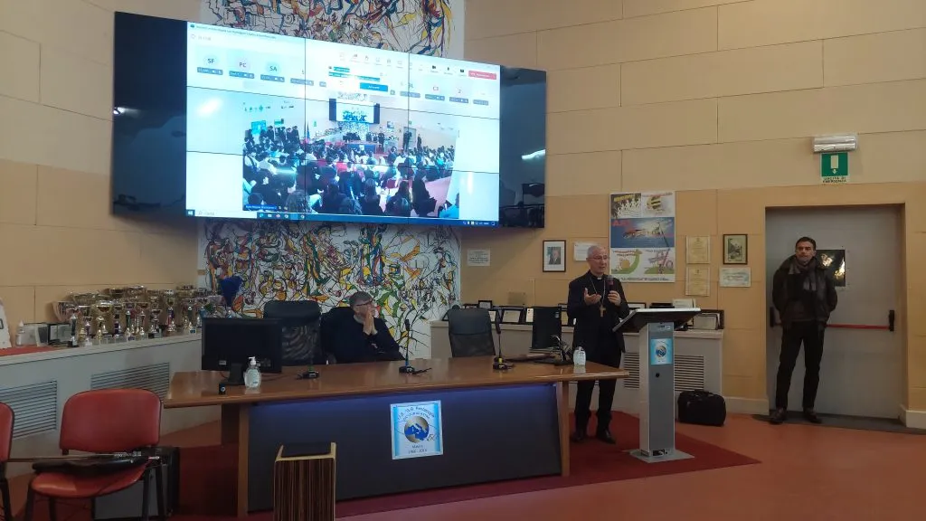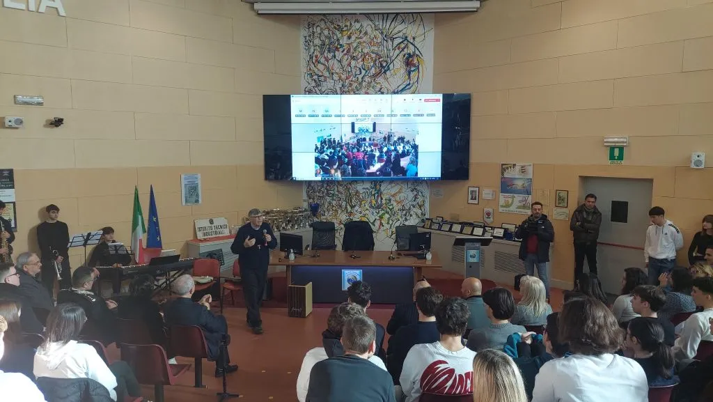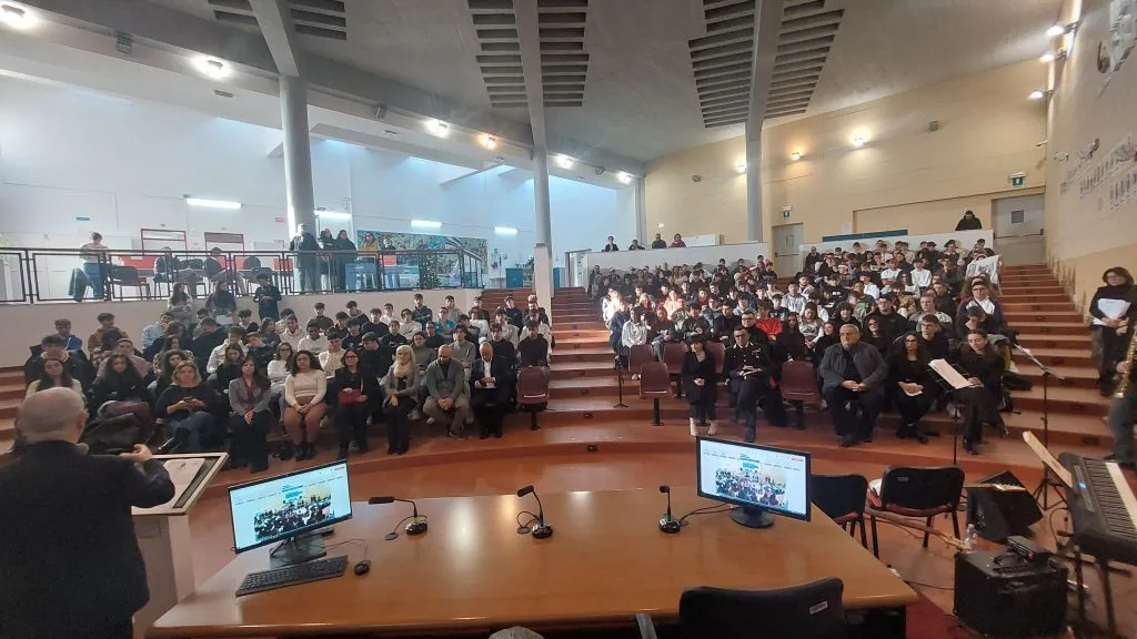 Fisicamente presenti in aula magna gli alunni di sei classi dell’Istituto, mentre gli altri seguivano in diretta attraverso gli schermi presenti nelle loro aule.