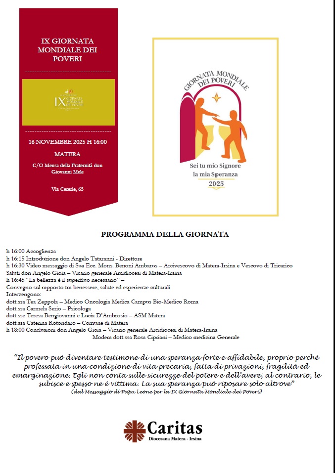 In occasione della IX Giornata Mondiale dei Poveri, istituita da Papa Francesco, domenica 16 novembre alle ore 16:00 – presso la sede della Mensa della Fraternità don Giovanni Mele nel Rione Piccianello di Matera – la Caritas diocesana di Matera-Irsina presenterà l’iniziativa “La bellezza è il superfluo necessario”.