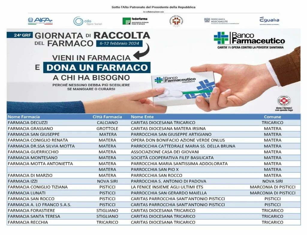 Alla raccolta hanno aderito 17 farmacie in provincia di Matera, gli enti assistiti sono 14. Una novità è rappresentata dalla partecipazione di una associazione di “farmacisti volontari ”, costituitasi dopo il terremoto dell’Aquila e da allora iscritti alla Protezione civile nazionale, che in alcune province (tra cui Matera) allestiranno nelle piazze dei banchetti informativi per sostenere la raccolta.