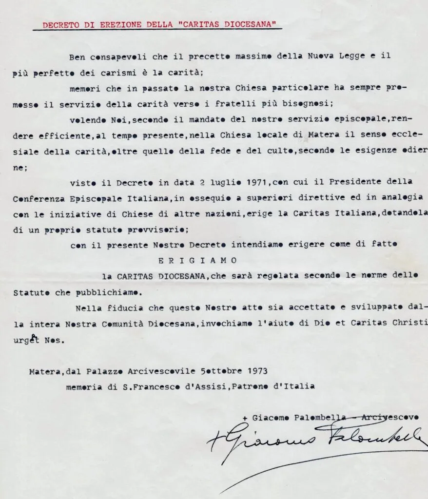Di seguito copia del Decreto di erezione della Caritas diocesana di Matera-Irsina di cui oggi si festeggiano i 50 anni: