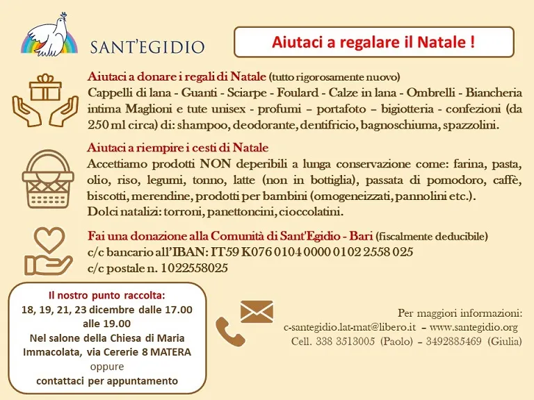 La Comunità di Sant’Egidio di Matera sarà lieta di accogliere i doni dei benefattori nelle giornate del 18, 19, 21 e 23 dicembre dalle ore 17.30 alle ore 20.00, presso il salone parrocchiale della chiesa dell’ Immacolata in via Cererie, 8 Matera.