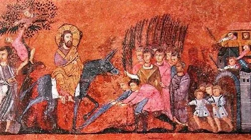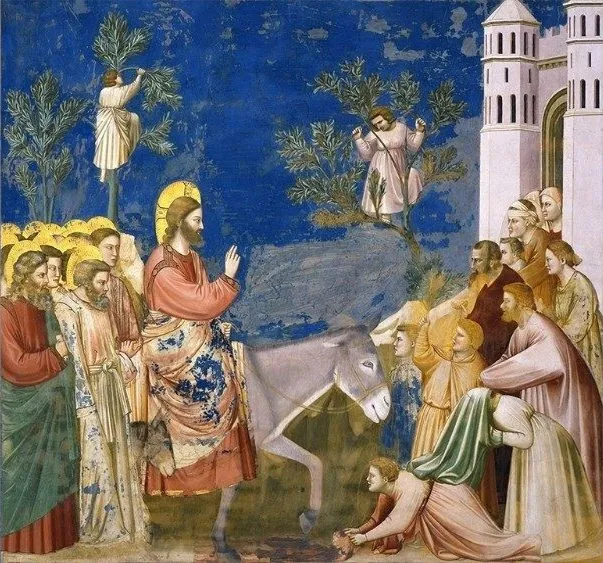 Per chi ha avuto modo di vederlo da vicino, questo meraviglioso affresco, che si trova della Cappella degli Scrovegni a Padova, ne è rimasto estasiato per i significati che esso esprime. E’ una raffigurazione di una bellezza sorprendente e prodigiosa per il suo tempo. Possiamo osservare la vitalità della rappresentazione, con le diverse reazioni del popolo di Gerusalemme al passaggio di Gesù: due figure che si sono arrampicate sugli alberi per prendere dei rami da agitare al passaggio di Gesù, altri che si inchinano, altri che osservano, scrutano. L’altra raffigurazione straordinaria, che fa soffermare lo sguardo, è rappresentata dall’asina che porta Gesù. Questa sembra avere una espressione umana, sorridente, come se fosse consapevole del compito che sta svolgendo. Crediamo che non si possa fare a meno di partire da questo affresco, che segna l’inizio della settimana di passione, per affrontare le successive fasi, sino alla Resurrezione di Gesù.