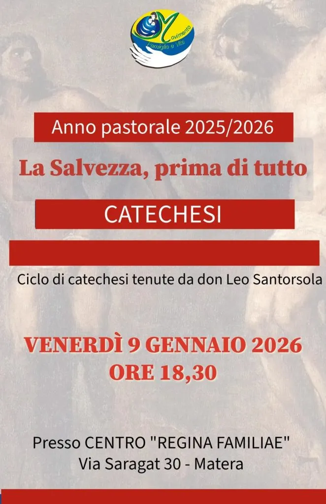 Venerdì 9 gennaio alle ore 18,30 presso il Centro "Regina Familiae" Via Saragat,30 in Matera, si terrà un incontro di catechesi tenuto da don Leo Santorsola nell'ambito del ciclo previsto nell'anno pastorale 2025-26.