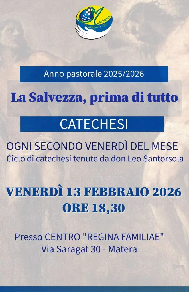 Venerdì 13 febbraio alle ore 18,30 presso il Centro Regina Familiae in Via Saragat, don Leo Santorsola terrà una catechesi su "La Savezza, prima di tutto".
