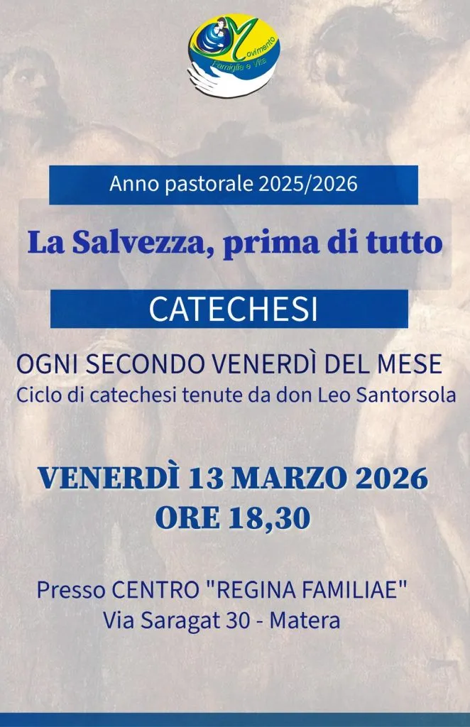 Venerdì 13 marzo, presso il Centro Regina familiae del Movimento famiglia e Vita in Matera, don Leo Santorsola, Fondatore del Movimento, terrà una catechesi.