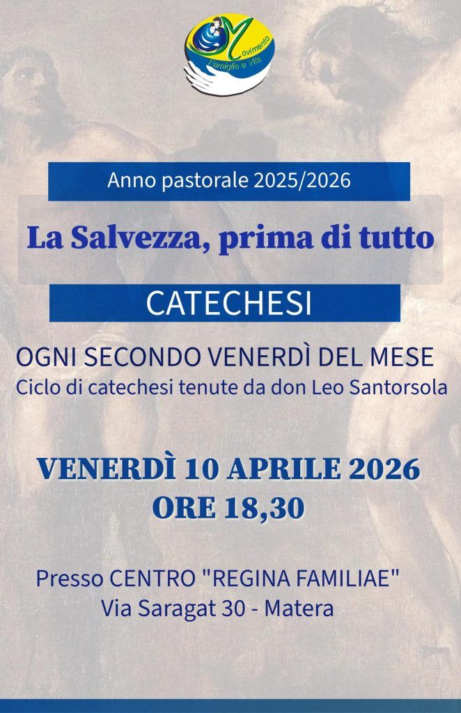 Venerdì 10 aprile, alle ore 18.30, presso il Centro Regina familiae del Movimento Famiglia e Vita in Matera, don Leo Santorsola, Fondatore del Movimento, terrà una catechesi.