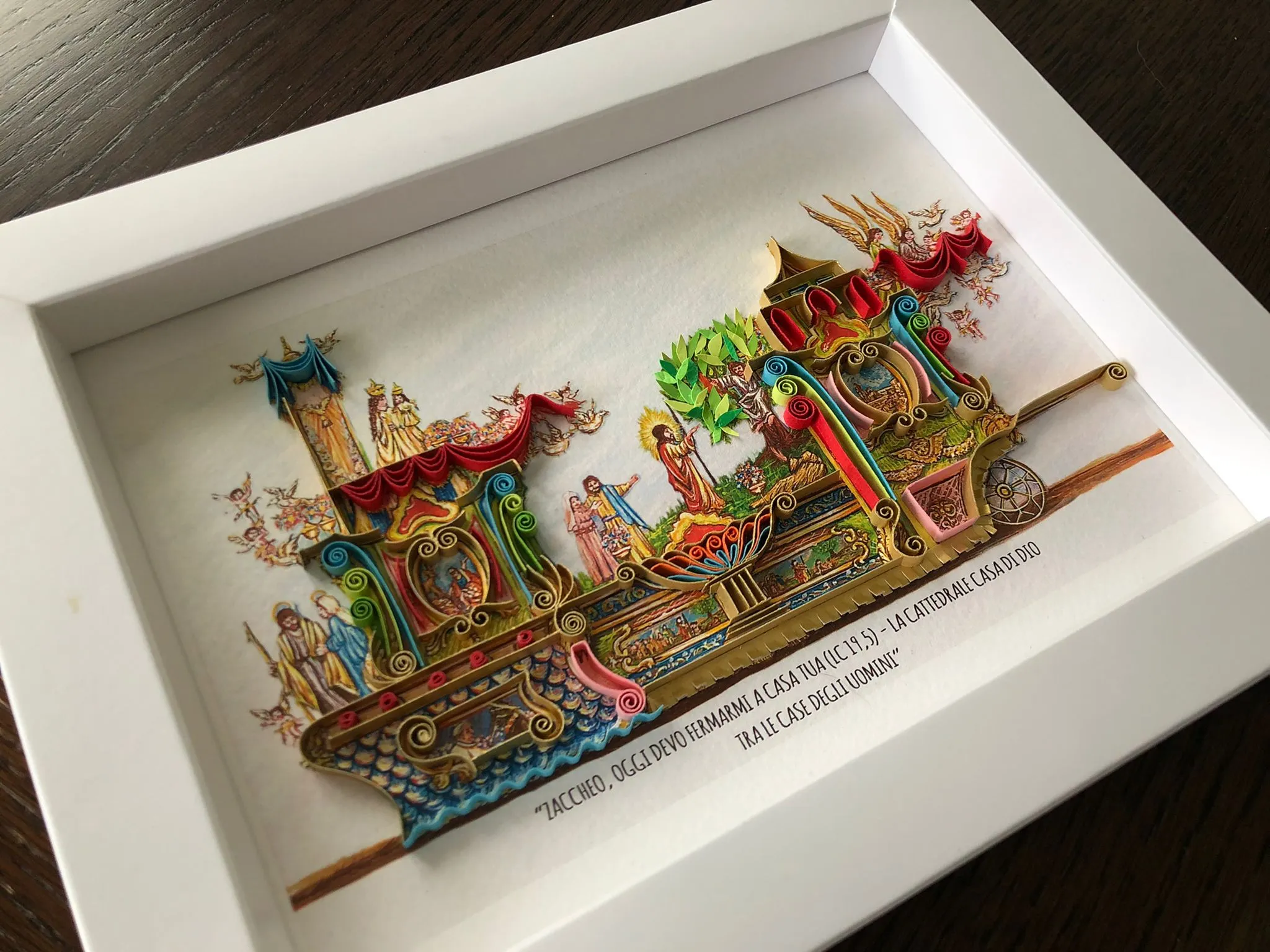 Un magnifico carro della Bruna realizzato con la tecnica del quilling: se la modalità è insolita, il risultato è sorprendente. Il “soggetto” ricalca il bozzetto del 2020 del Maestro Uccio Santochirico sul tema “Zaccheo, oggi devo fermarmi a casa tua (tratto dal Vangelo di Luca capitolo 19 versetto 5) – La Cattedrale, casa di Dio tra le case degli uomini”. La firma è di due artiste materane, Licia Santospirito (a destra nella foto) e Maria Rosaria Ferrante. La loro maestria è stata scoperta casualmente dal dottor Bruno Caiella, presedente dell’Associazione Maria Santissima della Bruna, che aveva ammirato il campione di un’opera destinato a un hotel della città dei Sassi.