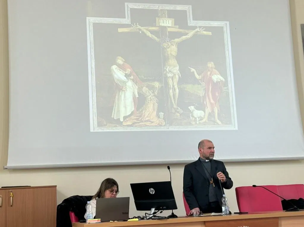 Gesù – ha ricordato il vescovo – è un “iperattivo del cuore”: la sua passione è l’amore immenso di Dio che, nell’incarnazione, si china su ogni uomo. Il beneficiario della parabola siamo noi: Cristo non è “passato oltre”, ma ci viene a cercare. «Si mise in cammino», leggiamo spesso nel Vangelo; e nella Crocifissione dell’Altare di Isenheim, proiettata durante la meditazione, Cristo appare con i piedi deformi per il tanto camminare.
