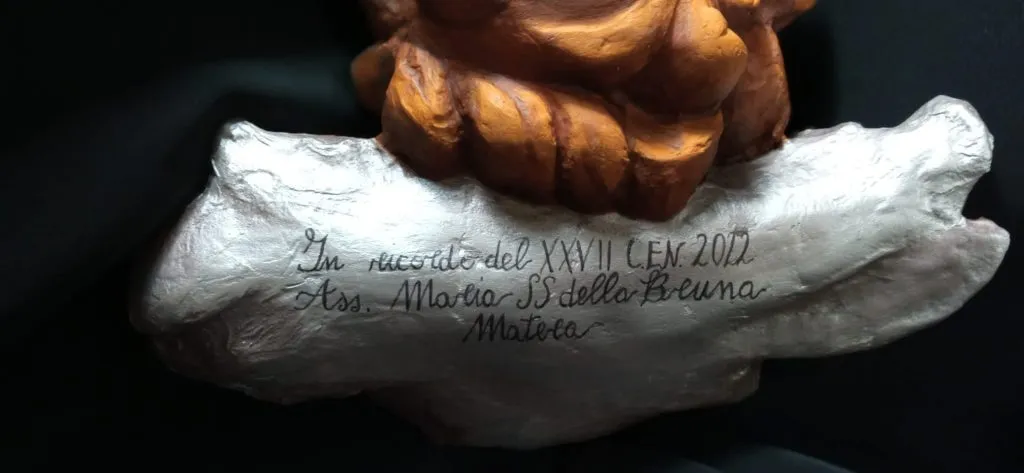 L’Associazione Maria SS. della Bruna, invitata a partecipare alla Celebrazione Eucaristica presieduta da Francesco nello stadio XXI Settembre “Franco Salerno”, ha quindi raccolto con favore ed entusiasmo l’idea di Annalisa e farà dono dello splendido puttino da lei realizzato e personalizzato con la scritta “Realizzato in occasione del XXVII C.E.N. 2022 – Ass. Maria SS. della Bruna – Matera”, al Pontefice.