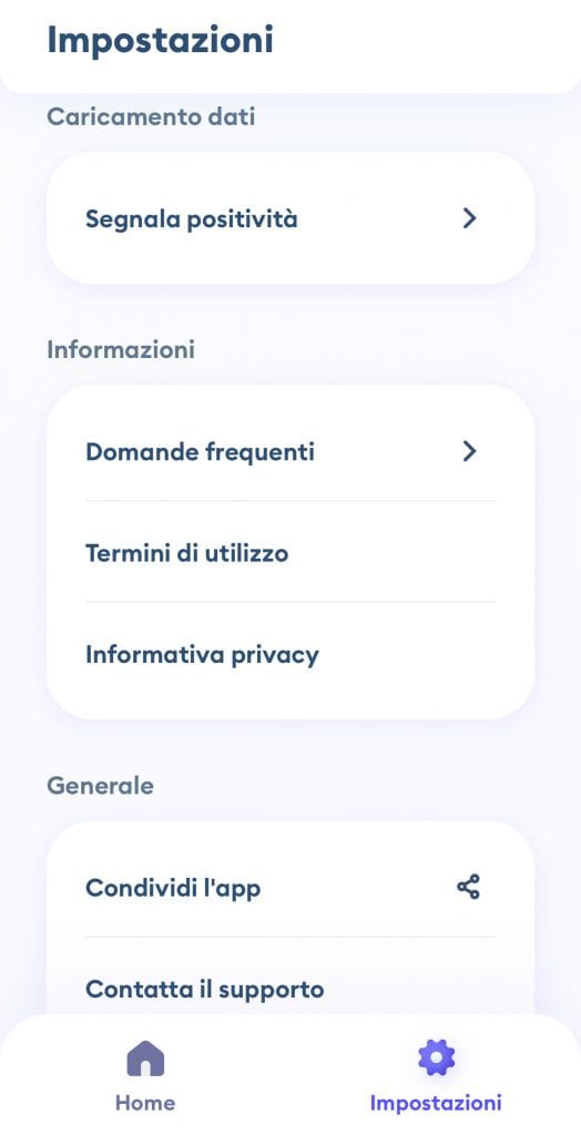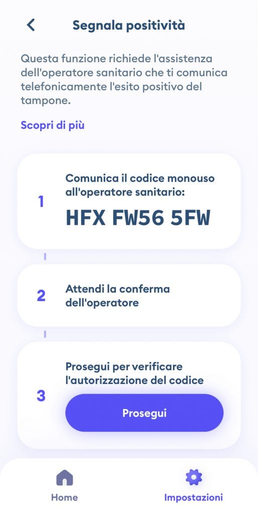 Per ottenere il codice monouso occorre andare nella sezione Impostazioni, passaggio non del tutto intuitivo, e poi cliccare alla voce Segnala positività.