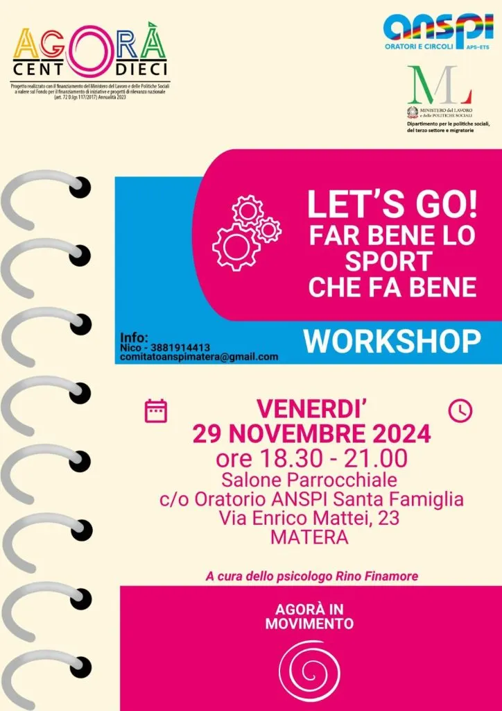 Promosso nell’ambito del progetto Centodieci Agorà, finanziato dal Ministero del Lavoro e delle Politiche Sociali, il workshop si propone di formare animatori, educatori e operatori sportivi sulle potenzialità dello sport come esperienza capace di generare valori profondi, in linea con l’impegno cristiano verso l’inclusione e l’educazione integrale della persona.