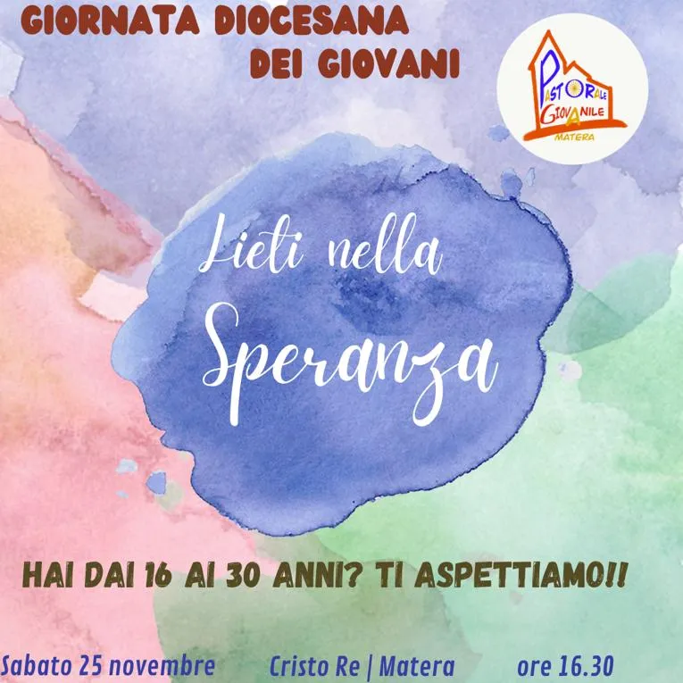 “Lieti nella speranza” il tema del incontro diocesano dei giovani, organizzato da don Gianpaolo Grieco e dall’Équipe Diocesana di Pastorale Giovanile per sabato 26/11 ore 16:30 nel Salone della Chiesa di Cristo Re!