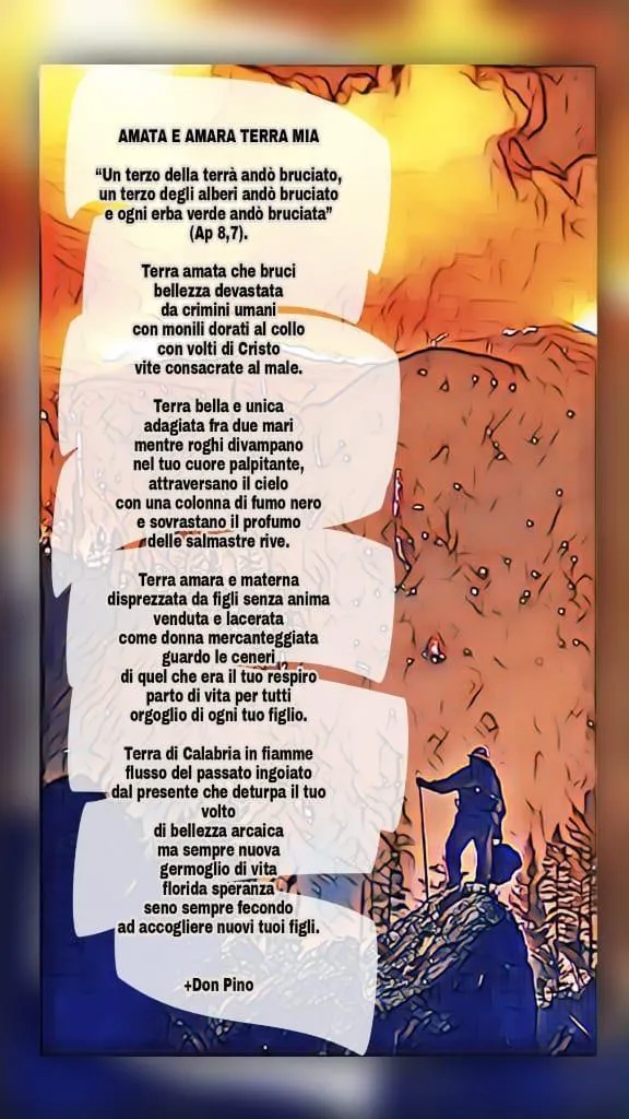 Della devastazione che hanno operato gli incendi in Calabria ne dà un’idea più compiuta in forma poetica un suo figlio affezionatissimo, l’arcivescovo di Matera-Irsina mons. Antonio Giuseppe Caiazzo di cui si riporta solo questo significativo passo: Terra amara e materna/disprezzata da figli senza anima/venduta e lacerata/come donna mercanteggiata/guardo le ceneri/ di quel che era il tuo respiro/parto di vita per tutti/orgoglio di ogni tuo figlio. In queste parole traspaiono evidenti l’amore e il dolore di un figlio per la sua madre terra che viene deturpata da gente senza scrupoli.