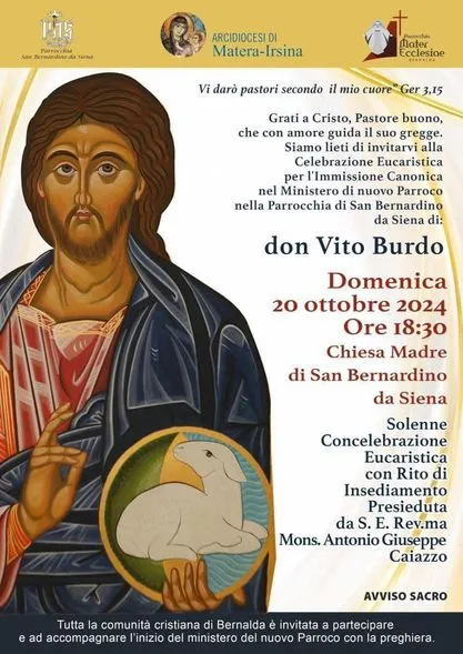 Carissimo don Vito, con le sole forze umane e con le buone intenzioni, riusciremmo a fare ben poco: abbiamo bisogno della grazia del Signore. Per questo ci affidiamo a Lui, al Signore, e ci affidiamo anche al nostro patrono S. Bernardino, esempio di integrità evangelica e di grande amore filiale per la Santa Trinità: il suo trigramma campeggia su molte case qui da noi. La Beata Vergine Maria e i nostri Santi Protettori ci aiutino, affinché possiamo crescere insieme nella fede, nell’esercizio della carità e nella speranza, virtù teologali proprie di chi è consapevole che la nostra storia ha un senso e una direzione: è un cammino meraviglioso e straordinario di redenzione e di salvezza. E nei prossimi anni lo faremo con lei, don Vito. La ringraziamo sin da ora per il suo apostolato nella nostra comunità.