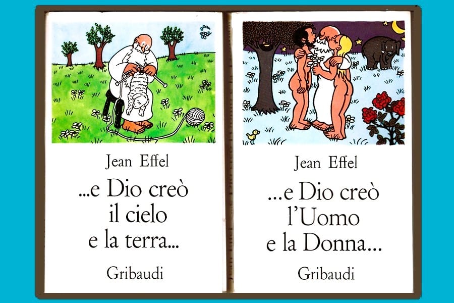 Un anno dopo, in Italia viene pubblicato il volumetto …e Dio creò il cielo e la terra. L’editore Gribaudi ricorda: «Libretto strepitoso, tutto di deliziose vignette, e successo altrettanto strepitoso. La prima edizione comparve il 30 ottobre 1969, ma la prima ristampa fu già a novembre dello stesso anno e la terza a febbraio del ‘70, non più cartonata ma in brossura con alette. Nel 1988 ne fu fatta un’edizione in formato 16×11, ma quelle precedenti sono da preferirsi. Dalla mia “presentazione”: “Opera di un autentico poeta… questo Dio dai tratti così umani, che con tanta cura trae dalla sua inesauribile fantasia un mondo ricco di mille meraviglie e lo foggia, lo guida, lo educa nei minimi dettagli, è l’emblema cordiale di una ‘fatica d’amore’ carica di una tenerissima partecipazione alle sorti dell’universo”. Il fatto curioso è che a queste parole aggiungevo: “È scontato che la familiarità poetica con cui Jean Effel tratta delle ‘cose celesti’ potrà riuscire non gradita a qualcuno, tanto più che l’umorismo di questo grandissimo disegnatore nasce da un’abilissima concatenazione di parecchi piani prospettici…” Il che significa che i tempi erano davvero ancora grigi e la prudenza non era mai troppa».
