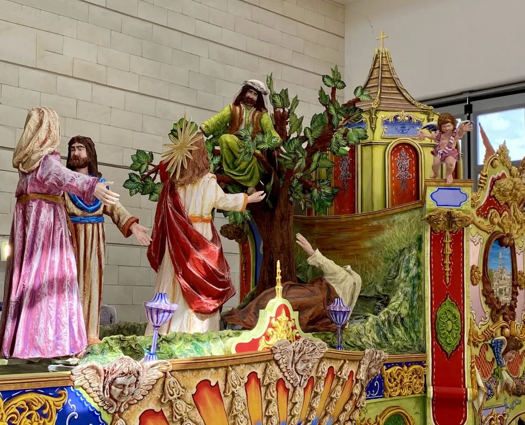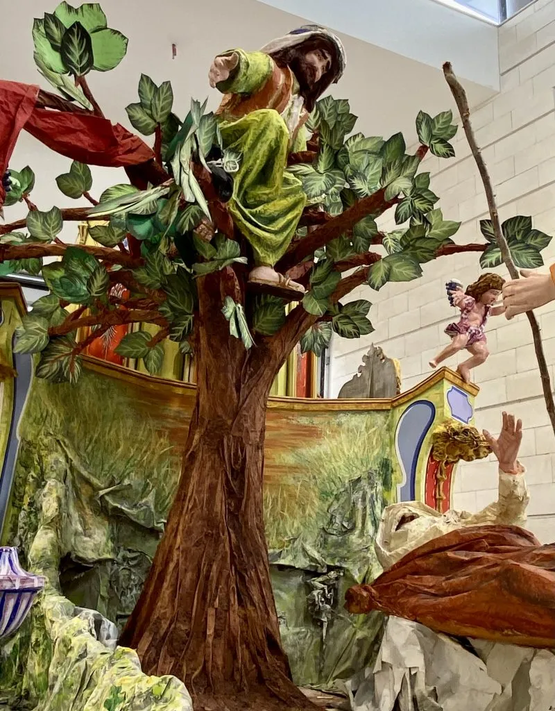 Al centro della scena c’è un albero frondoso a rappresentare il sicomoro del racconto evangelico su cui si arrampicò, mosso dalla curiosità, un ometto di bassa statura di nome Zaccheo che era desideroso di vedere Gesù.