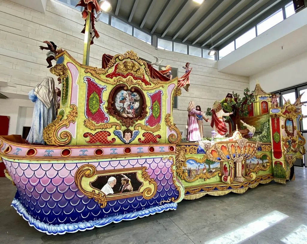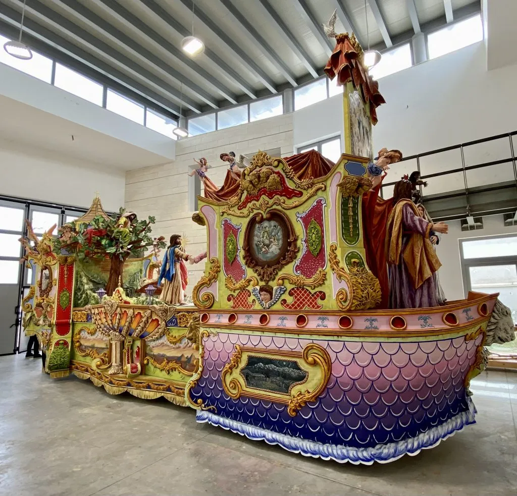 Osservato di profilo il maestoso manufatto si presenta con dei contorni a forma di barca che mostra a poppa le figure di Giuseppe e della vergine Maria incinta; un rosso drappeggio proteso verso l’alto e contornato di angeli si distende ai piedi dello spazio che accoglierà la venerata statua della Vergine con il Bambino.