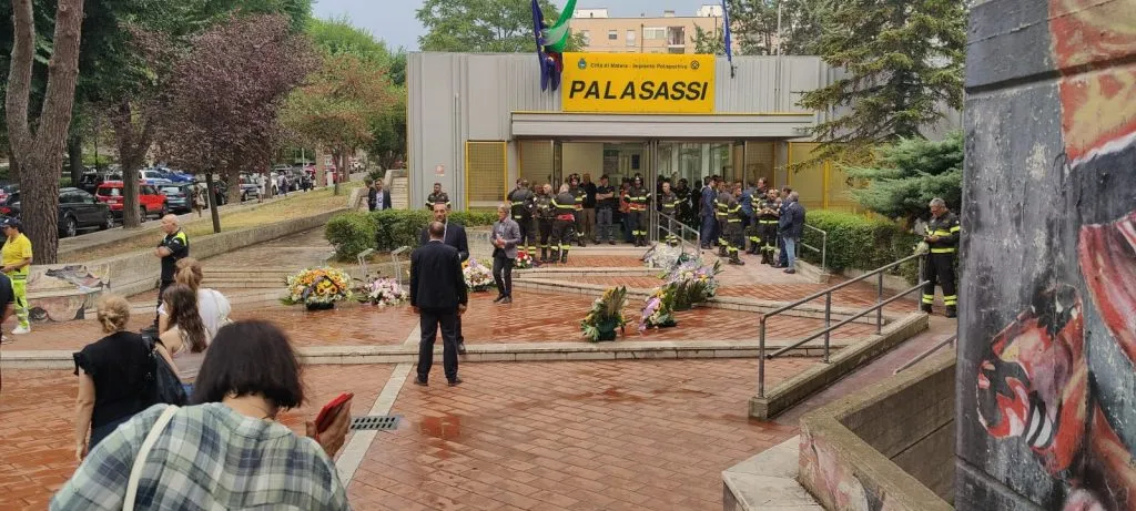Silenzio religioso e surreale anche nella caserma dei Vigili del Fuoco, interrotto solo dagli squilli di tromba e da una sirena. Compostezza, commozione, attenzione. Il pensiero di ciascuno ai due Vigili – si potrebbe dire riprendendo una riflessione dell’Arcivescovo nell’omelia – crocifissi “da malvagità o incuria di altri uomini”. Qualcuno piange. I Vigili giunti per l’occasione sono forse cinquecento: lucani, pugliesi e non solo. Quattro-cinque di loro caricano le due bare di Nicola Lasalata e Giuseppe Martino sull’autoscala, le ricoprono con una bandiera, con l’elmetto e con la foto. E scortati da un folto corteo di vigili, parenti e amici giungono nel PalaSassi.