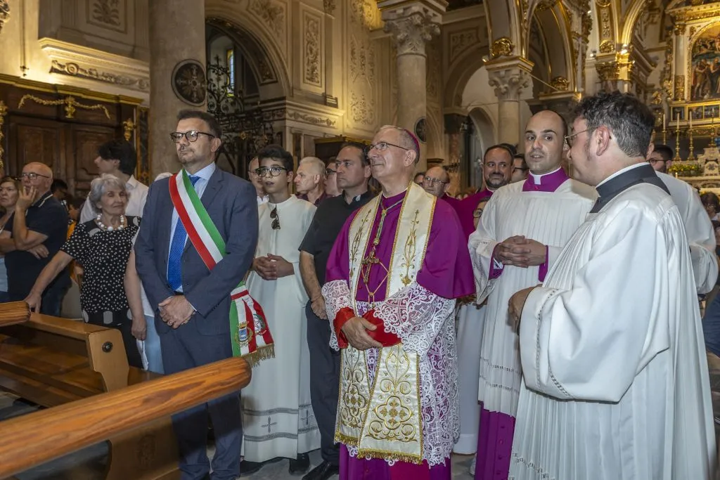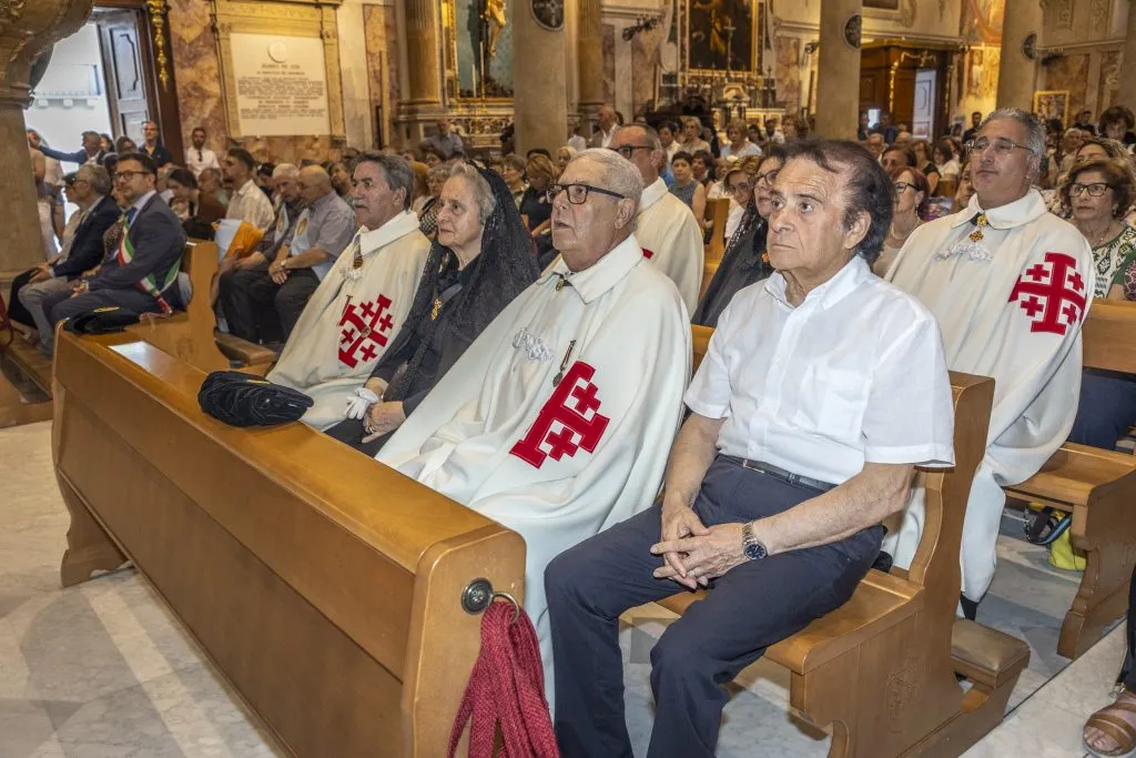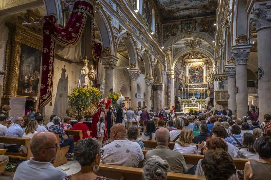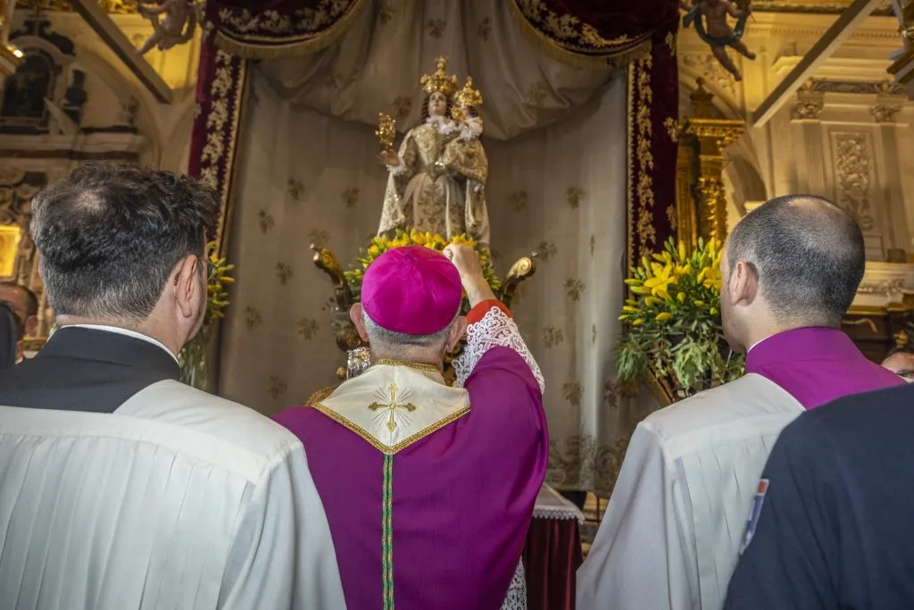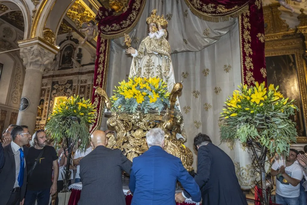 Ore 19. Ecco che – accolta da uno scrosciante applauso, dalle invocazioni “Evviva, Maria!” e dal canto “O Maria quanto sei bella” sostenuto dall’intera assemblea – la sacra effige di Maria entra in una Cattedrale gremitissima dov’è solennemente intronizzata sotto il baldacchino appositamente preparato sormontato dalla maestosa corona che vi campeggia tutto l’anno.