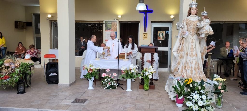 Nel pomeriggio, la Santa Messa presieduta da don Angelo Gioia, Vicario Generale, con l’amministrazione del sacramento dell’unzione degli infermi, momento bello. Sei sacerdoti si avvicinavano agli ammalati per l’unzione degli infermi. Alla fine della messa, prima della benedizione solenne, siamo andati tutti vicino alla Madonna per la preghiera del Magnificat e l’incensazione dell’effige della Madonna.