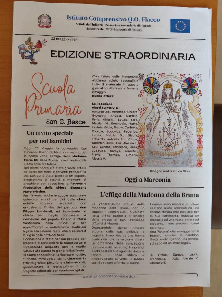 I bambini delle classi quinte della Scuola Primaria del plesso di Via San Giovanni Bosco Primaria hanno preparato un’edizione straordinaria del loro giornalino sulla venuta della Madonna della Bruna, con articoli e interviste al Parroco e alle catechiste. Anche toccante il momento in cui i ragazzi hanno cantato l’”Ave Maria” e sventolavano un fazzoletto bianco. Alle 12, anche oggi, la supplica.