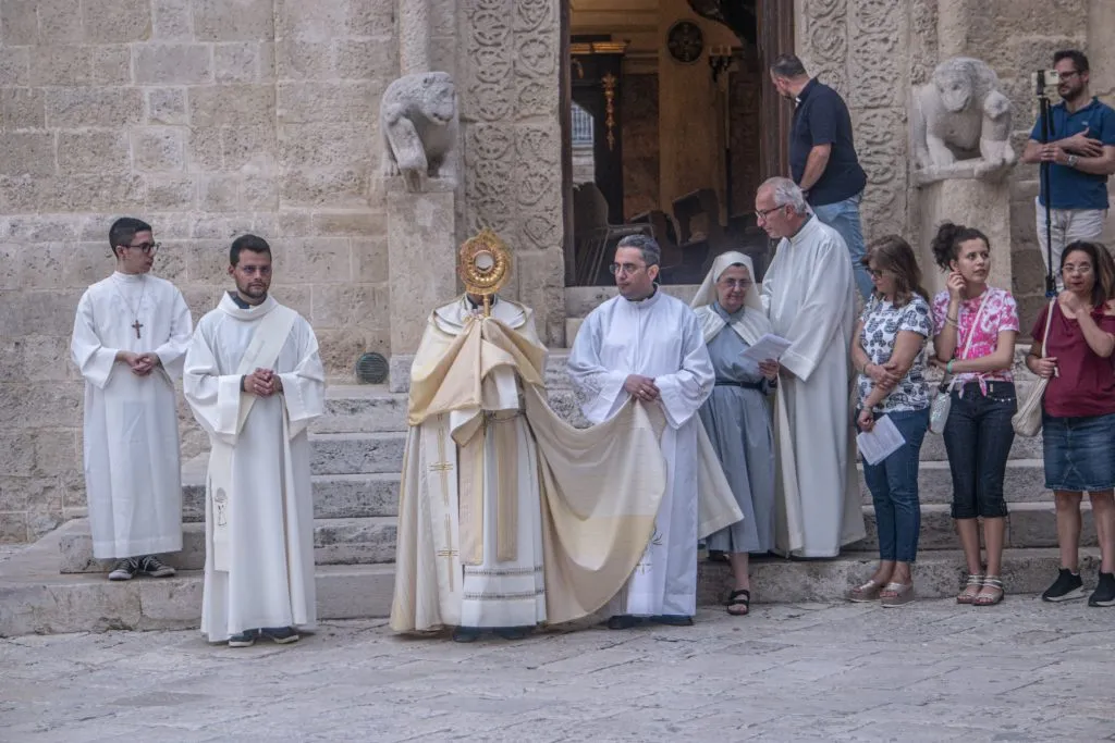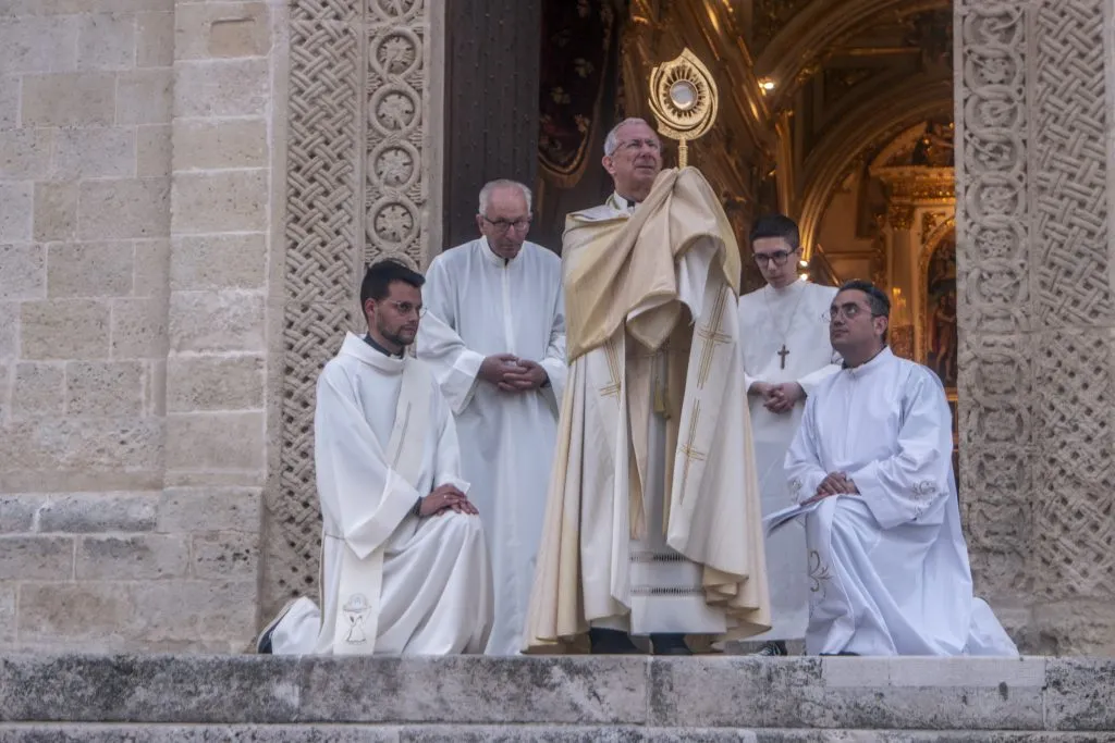 Molto bello il momento dell’uscita con Gesù Sacramentato fuori dall Cattedrale: una piccola processione eucaristica in piazza Duomo, che ha coinvolto i passanti e i clienti al bar prospicente la piazza. Dal sagrato della cattedrale il vescovo ha impartito la benedizione all’intera città e con la preghiera universale è stato abbracciato tutto il popolo di Dio.
