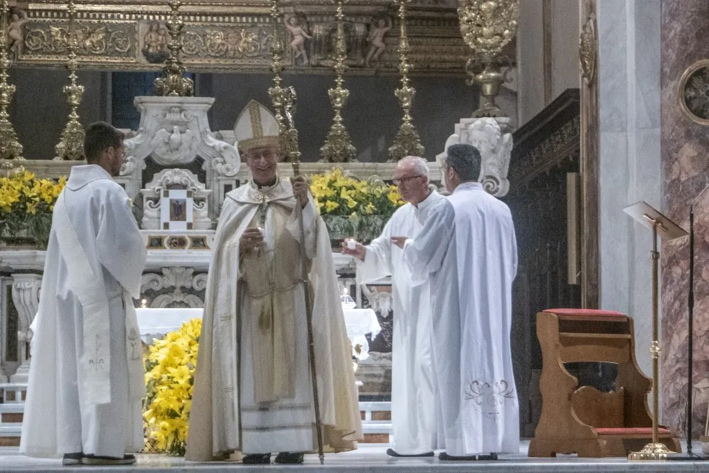 Ecco la giornata del 27 giugno – dopo il triduo predicato da mons. Pasquale Cascio (24-26 giugno), Arcivescovo di S. Angelo dei Lombardi, e prima di quello predicato da mons. Giovanni Ricchiuti (28-30 giugno), Vescovo emerito di Altamura e già Arcivescovo di Acerenza – interamente dedicata all’adorazione eucaristica nella cappella del Santissimo della Basilica Cattedrale. “Momento sacramentale in cui sto alla presenza di Gesù e contemplo l’umanità che ha sposato la divinità”, ha detto il nostro Arcivescovo nell’omelia dell’unica Eucaristia celebrata in Cattedrale al mattino, che ha introdotto questa giornata eucaristica. E “non importa fare tanto. Non chi dice: Signore, ho fatto questo! Signore, ho fatto quello, entrerà nel Regno”, sono ancora le parole di Mons. Caiazzo a commento del brano del Vangelo.