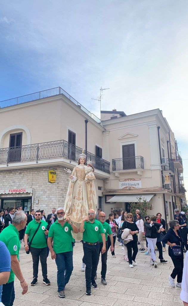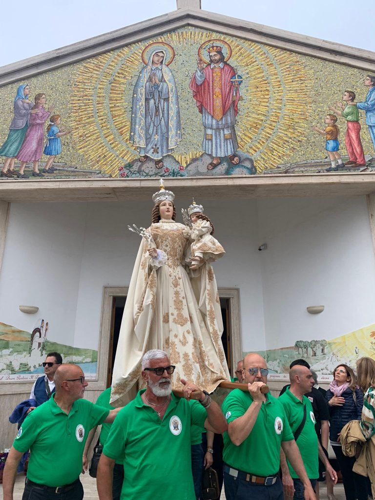 Nel pomeriggio, dopo la solenne celebrazione dei vespri comunitari, una bella processione ha accompagnato la Madonna verso “S. Antonio”, per le strade del paese vestite a festa, sotto i balconi a cui erano appese le più belle coperte, salutata dal lancio dei petali di rosa. Un momento che don Antonio, parroco di “Cristo Re”, soprattutto per l’attenzione nell’organizzazione, ha apprezzato particolarmente.