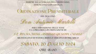 Il diacono Antonio Martelli, oggi 20 luglio 2024 è stato ordinato presbitero, presso la cattedrale di Tricarico, per l'imposizione delle mani e la preghiera...