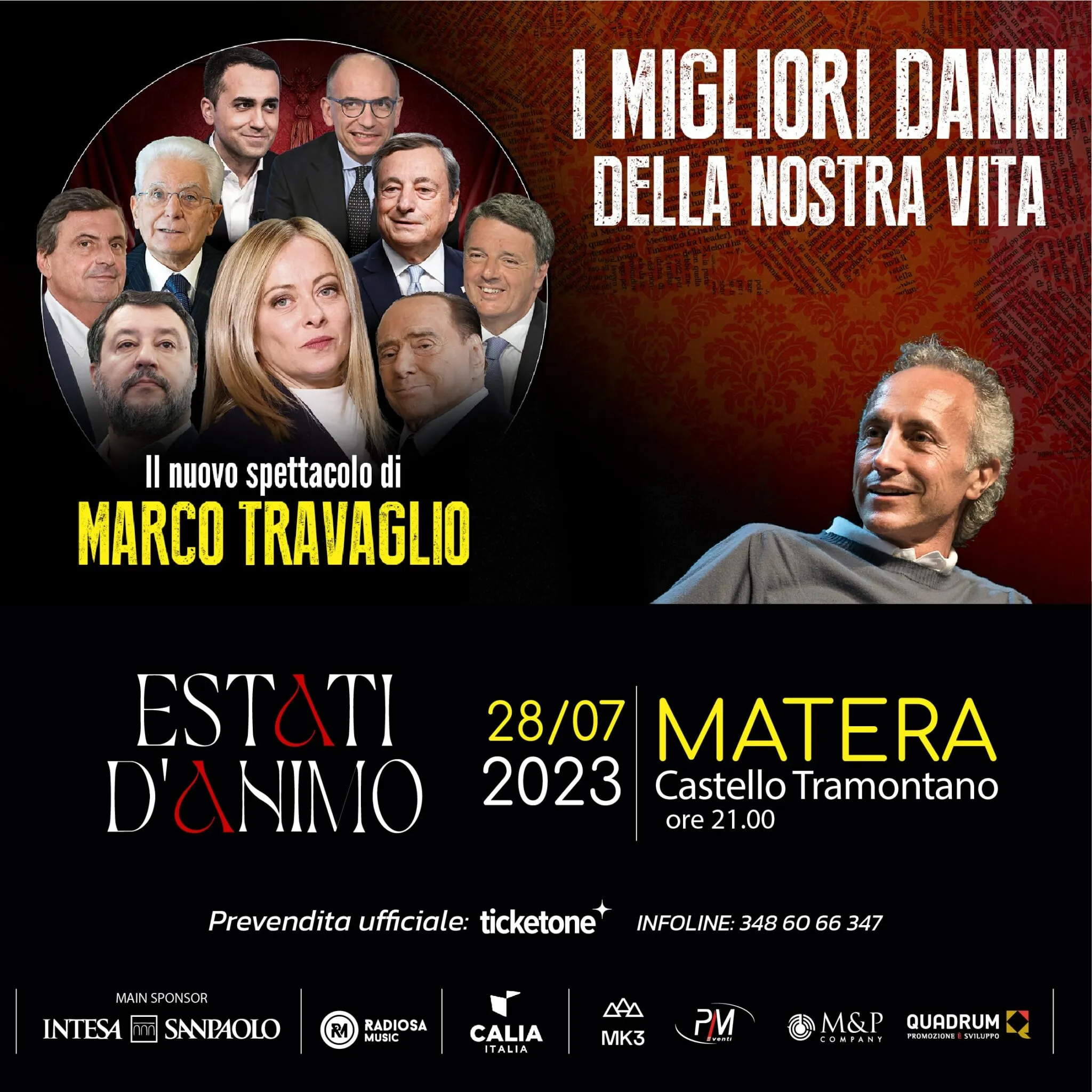 Marco Travaglio arriva a Matera questa sera, 28 luglio, con il suo nuovo spettacolo “I migliori Danni della Nostra Vita”, prodotto da Loft Produzioni per SEIF Società Editoriale Il Fatto. All’interno della rassegna “Estati D’Animo”, lo spettacolo di Marco Travaglio, nel consueto stile satirico, racconta gli ultimi cinque anni di storia italiana: ovvero come i poteri marci della politica, della finanza e dell’informazione hanno ribaltato il voto degli italiani del 2018, dal cambiamento alla restaurazione, dalla questione morale e sociale all’Ancien Régime e alla guerra infinita, rovesciando il governo Conte2 e consegnando l’Italia all’ammucchiata di Draghi, che ha spianato la strada al ritorno delle vecchie destre riverniciate da nuove dietro il volto di Giorgia Meloni.