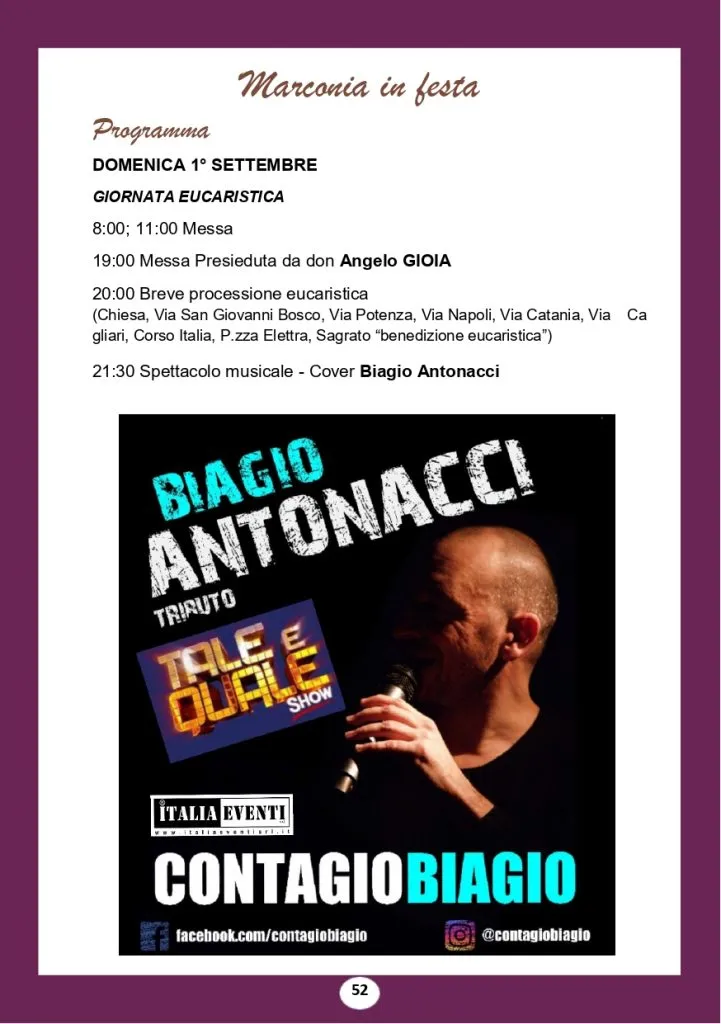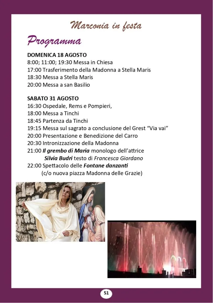 Domenica 1° settembre, in vista del giorno centrale della festa (domenica 8 settembre), prenderanno avvio a Marconia i festeggiamenti con la celebrazione eucaristica presieduta da don Angelo Gioia, Vicario Generale della Diocesi. A seguire, una breve processione eucaristica sul carro trionfale.