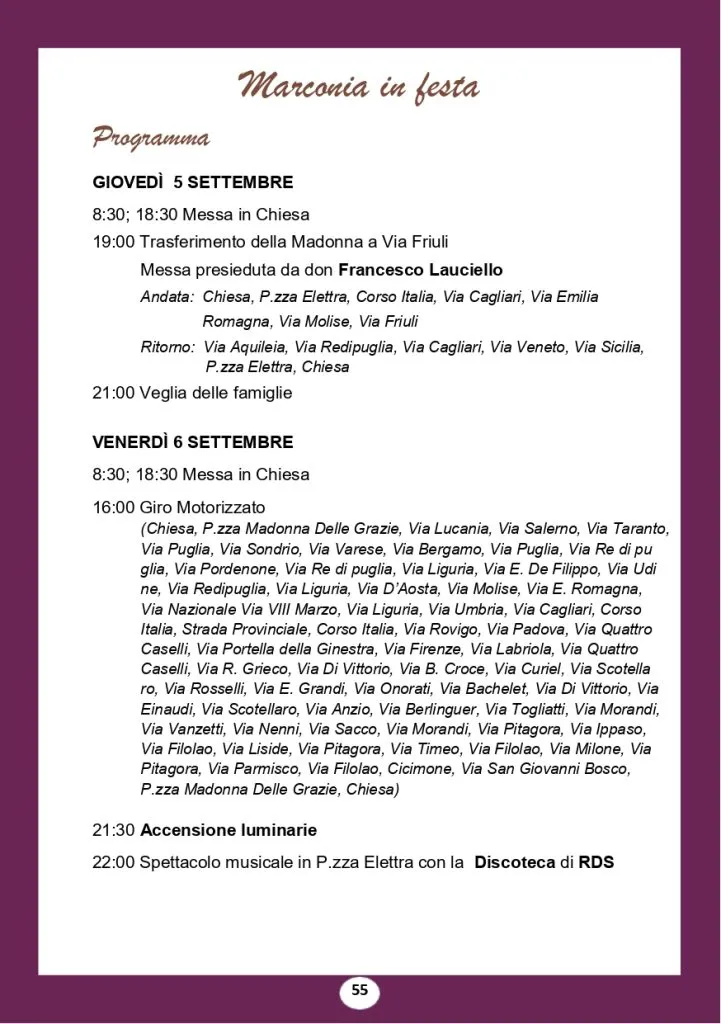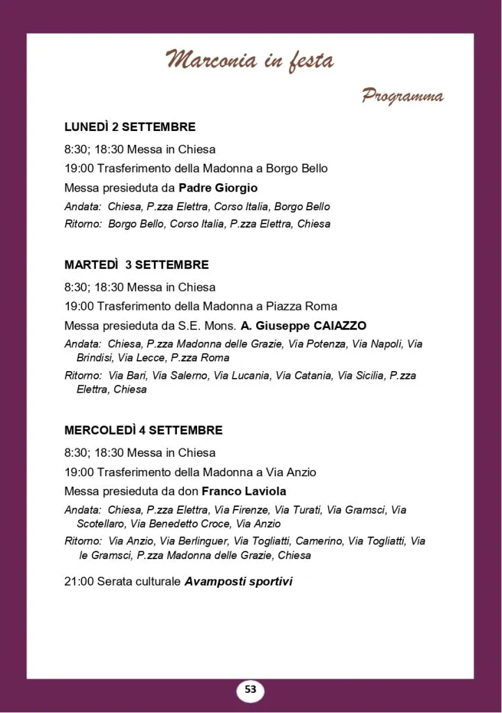 Dal 2 al 5 di settembre quattro serate di peregrinatio per le vie del borgo durante le quali verrà celebrata l’eucaristia negli spazi vissuti dalla gente (Borgo Bello, Piazza Roma, via Anzio, via Fiume). Quindi, venerdì 6 settembre, il giro “motorizzato” dell’effige mariana per altre strade di Marconia e l’accensione delle luminarie.