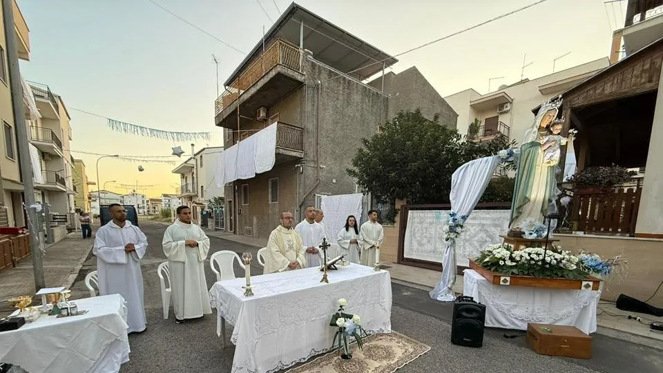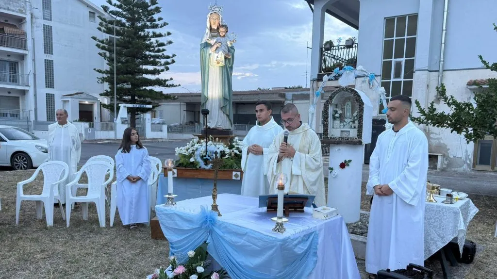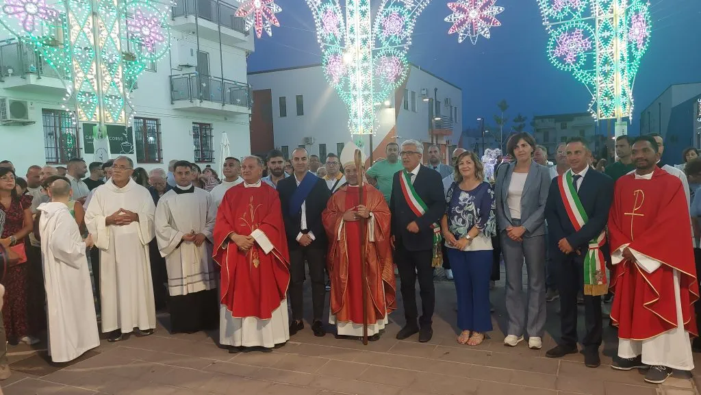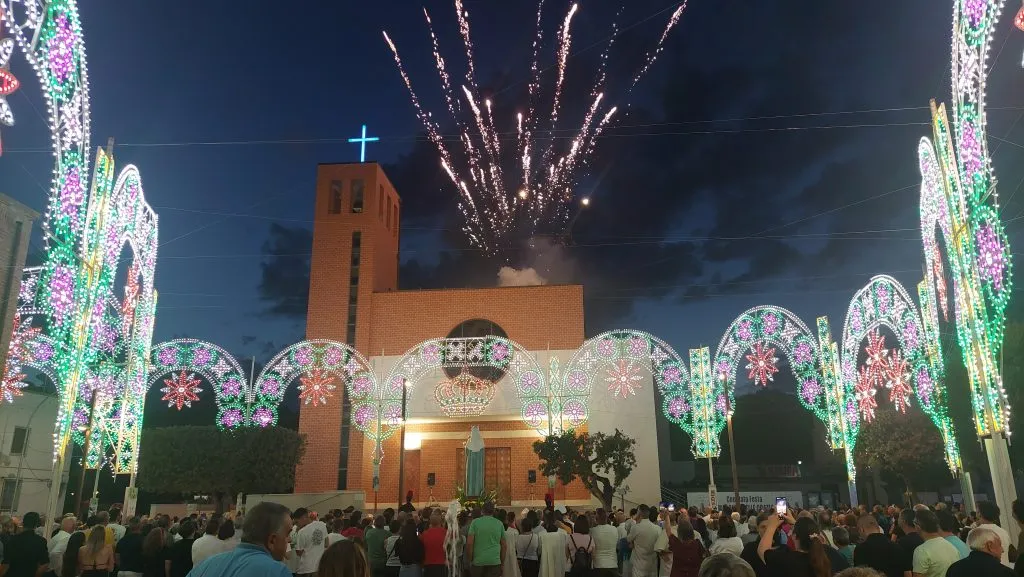 Il punto terminale della processione il sagrato, dove Maria è stata omaggiata dalla danza delle farfalle luminose e don Filippo ha impartito l’ultima benedizione, pregando anche per Papa Leone di cui, come per la Parrocchia “San Giovanni Bosco” nel 2025, ricorreva quel giorno il 70° compleanno.