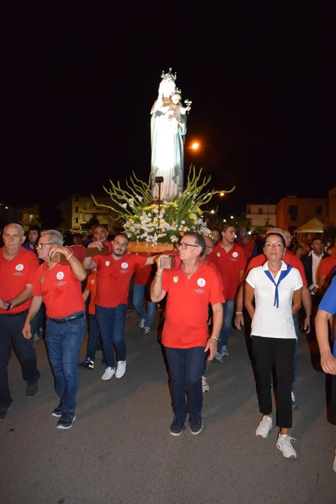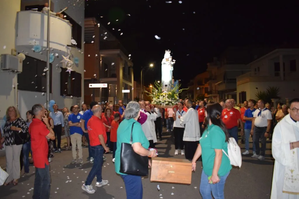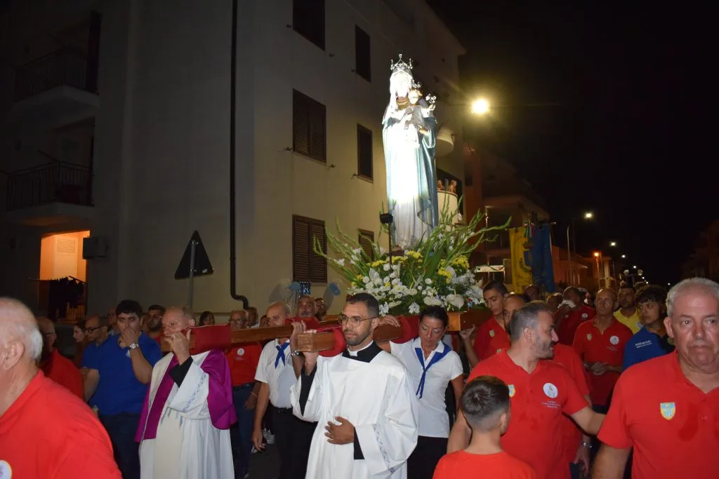 La Madonna era portata a spalla dai latori di Marconia, Bernalda e Pisticci, con tanti volontari che, a rotazione, non hanno risparmiato il proprio supporto. E non hanno lesinato una spalla né don Filippo né Darlan, un giovane Verbita, che in quest’ultimo anno ha coadiuvato il parroco di San Giovanni Bosco in tante delle attività parrocchiali.