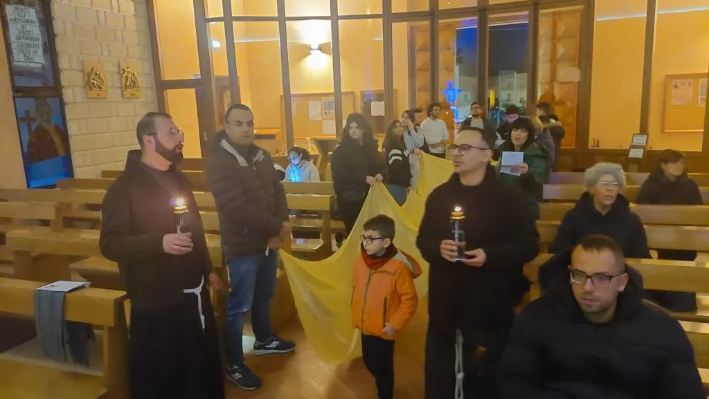 Significativi i segni che hanno accompagnato l’ascolto della Parola di Dio e delle fonti francescane e le invocazioni: un lenzuolo giallo, steso all’inizio della veglia nel corridoio centrale della chiesa, appigliato al crocifisso di S. Damiano, che ha richiamato la rete da pesca con cui i giovani sono stati pescati nella prima serata; l’abbraccio che i missionari hanno scambiato con ciascuno dei presenti: un gesto che richiama a quella mozione interiore, viscerale, la misericordia, che Francesco tra l’altro donò a un lebbroso; l’aspersione, segno di purificazione.