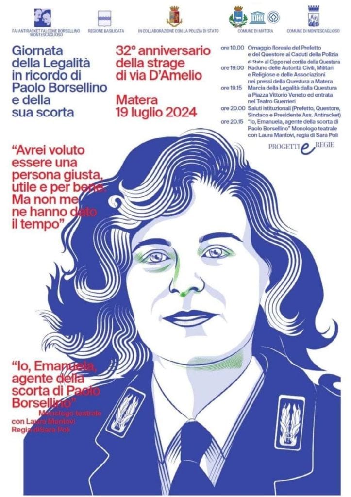 - ore 20:00, presso il Cineteatro “Guerrieri”, saluti istituzionali e monologo teatrale “Io, Emanuela, agente della scorta di Paolo Borsellino”, con Laura Mantovi, regia di Sara Poli. Alla marcia ed alla rappresentazione teatrale saranno presenti le Autorità civili, militari e religiose, oltre alle associazioni e ai cittadini che vorranno liberamente essere presenti. Pertanto, la cittadinanza è invitata.