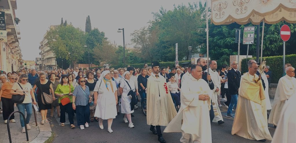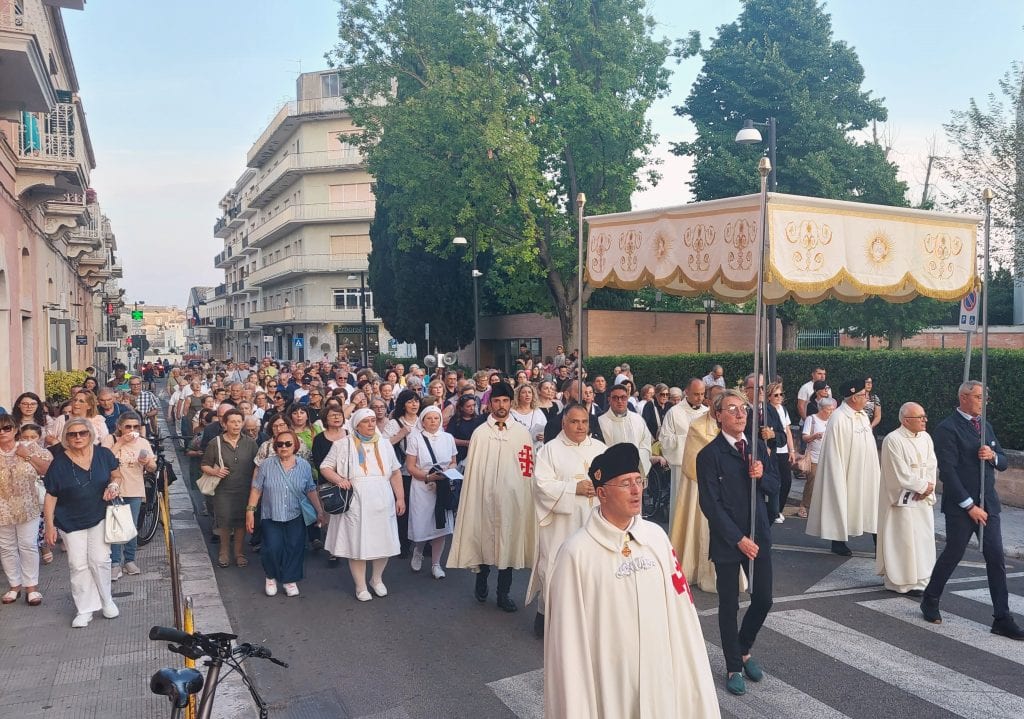 A seguire, la processione eucaristica, che ha coinvolto oltre che una folta rappresentanza di clero, i bambini che da poco hanno celebrato la prima comunione, le associazioni, le confraternite e il popolo di Dio in tutte le sue componenti. Un corteo di fedeli guidati da don Antonio Di Leo, direttore dell’Ufficio Liturgico Diocesano, è stato efficacemente coinvolto nella preghiera attraverso invocazioni litaniche eucaristiche, preghiere e canti. Non sono mancati opportuni momenti di silenzio o di riflessione guidata dall’ascolto di testi del magistero sull’Eucaristia e da alcuni passi dell’omelia che Papa Francesco ha tenuto a Matera in occasione del Congresso Eucaristico Nazionale.