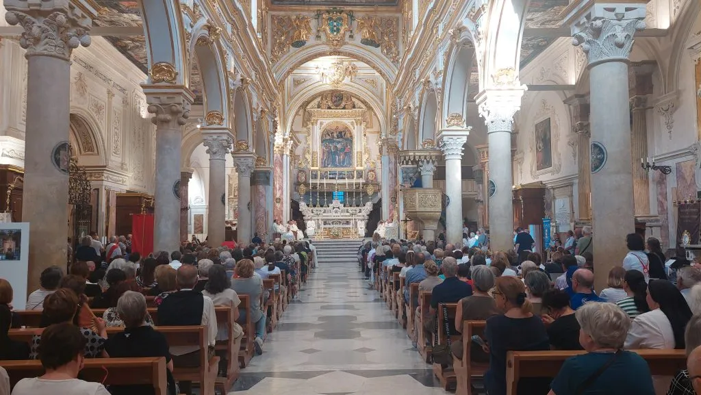 Sempre un momento edificante il passaggio di Gesù Eucaristia per le strade della città: ecco una mamma che al passaggio di Gesù Sacramentato ha fatto fare il segno di croce al figlio, forse di tre anni – guardava esterrefatto! –, di un uomo anziano che a fatica si inginocchia – non come il giovane che è al suo fianco! – e di alcuni che si sono alzati in piedi dai tavolini dei bar dov’erano seduti e di un signore che ha atteso prima di addentare la pizza. Molti filmano, forse per portare a casa un ricordo delle vacanze, riconoscendo comunque la straordinarietà dell’evento.