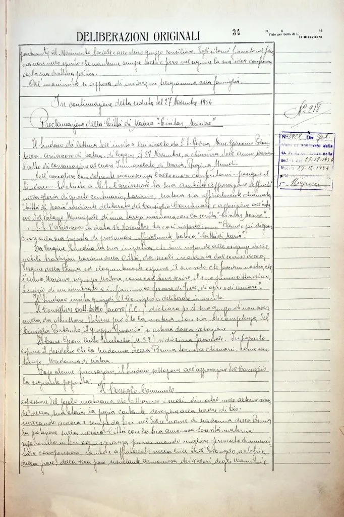 “Il consiglio Comunale, espressione del popolo materano – che attraverso i secoli dimostrò nelle alterne vicende della sua storia la propria costante devozione alla Madre di Dio, invocando ancora e sempre da lei, nel dolce nome di ‘Madonna della Bruna’ la protezione sulla nostra città con la sua amorosa soavità materna, riponendo in lei ogni speranza per un mondo migliore permeato di umanità e comprensione, unito e affratellato nella luce dell’Evangelo, artefice della pace, della vera pace, risultante armoniosa dei valori degli uomini e degli stessi valori di Dio – a felice conclusione dell’Anno Mariano delibera di proclamare Matera città di Maria”.