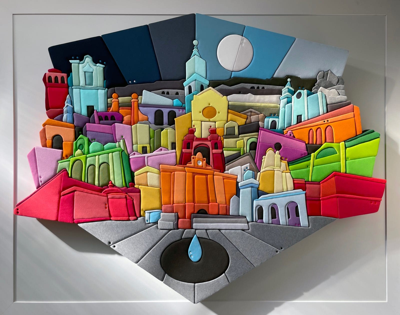 Lo studio del territorio e la documentazione prodotta sono i maggiori coadiuvanti per la rilettura che, attraverso la firma e la tecnica, uniche nel loro genere, si palesano attraverso una forma reinventata del luogo in cui è possibile riconoscere ed estrapolare le diverse morfologie architettoniche. A rendere ancor più interessante l’aspetto dell’opera è la ricerca del significato, il gesto attraverso il quale si identifica il concetto principe di tutto il lavoro svolto nel luogo.