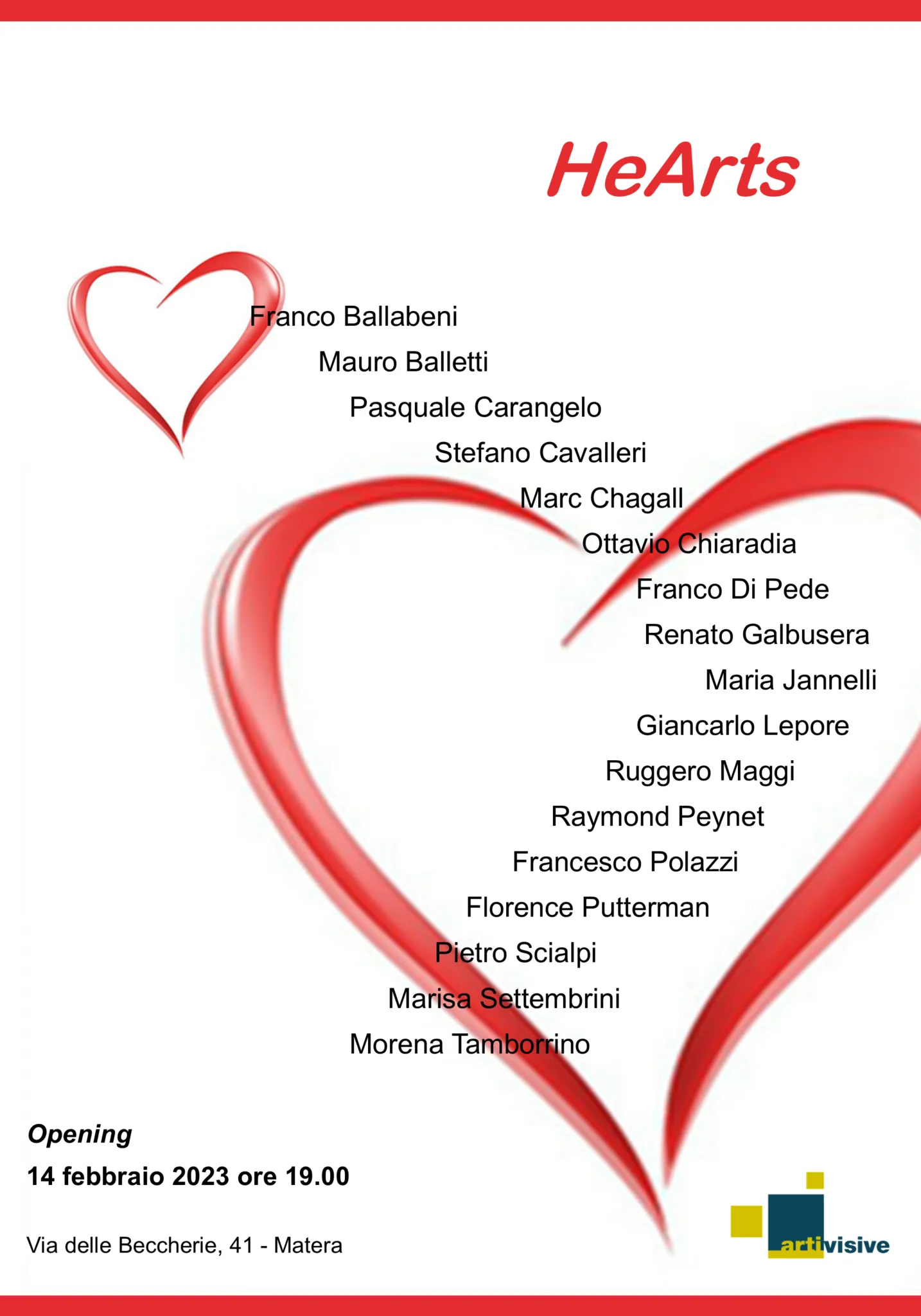 Rimarrà aperta fino al 26 febbraio nello Studio Arti Visive di Matera “HeArts” una mostra allestita con opere di artisti contemporanei.