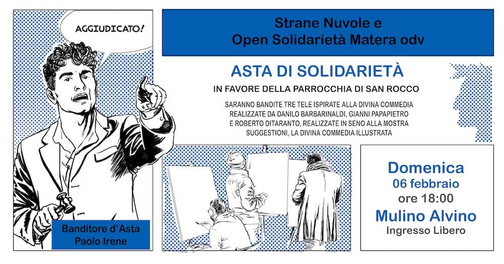 A seguito della Mostra “Suggestioni. La Divina Commedia Illustrata” che si è tenuta a Matera negli scorsi giorni, l’Associazione Strane Nuvole ha pensato di organizzare un’asta di solidarietà.