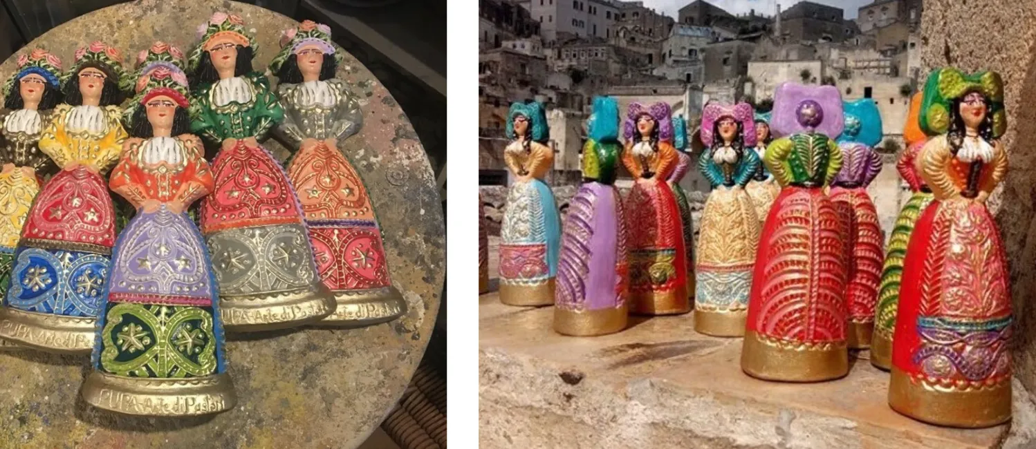 E’ proprio ispirandosi all’ antica tradizione pastorale di realizzare, in formaggio fuso, sagome a forma di animali o di donne stilizzate da usare come ciuccio per i neonati che, il Maestro Artigiano Mario Daddiego, grazie ad una serie di studi sulle origini e grazie alla sua creatività, ha dato vita a diversi prototipi di ‘’ donna materana’’ (bambola) cui ha dato l’appellativo di “La Pupa”.