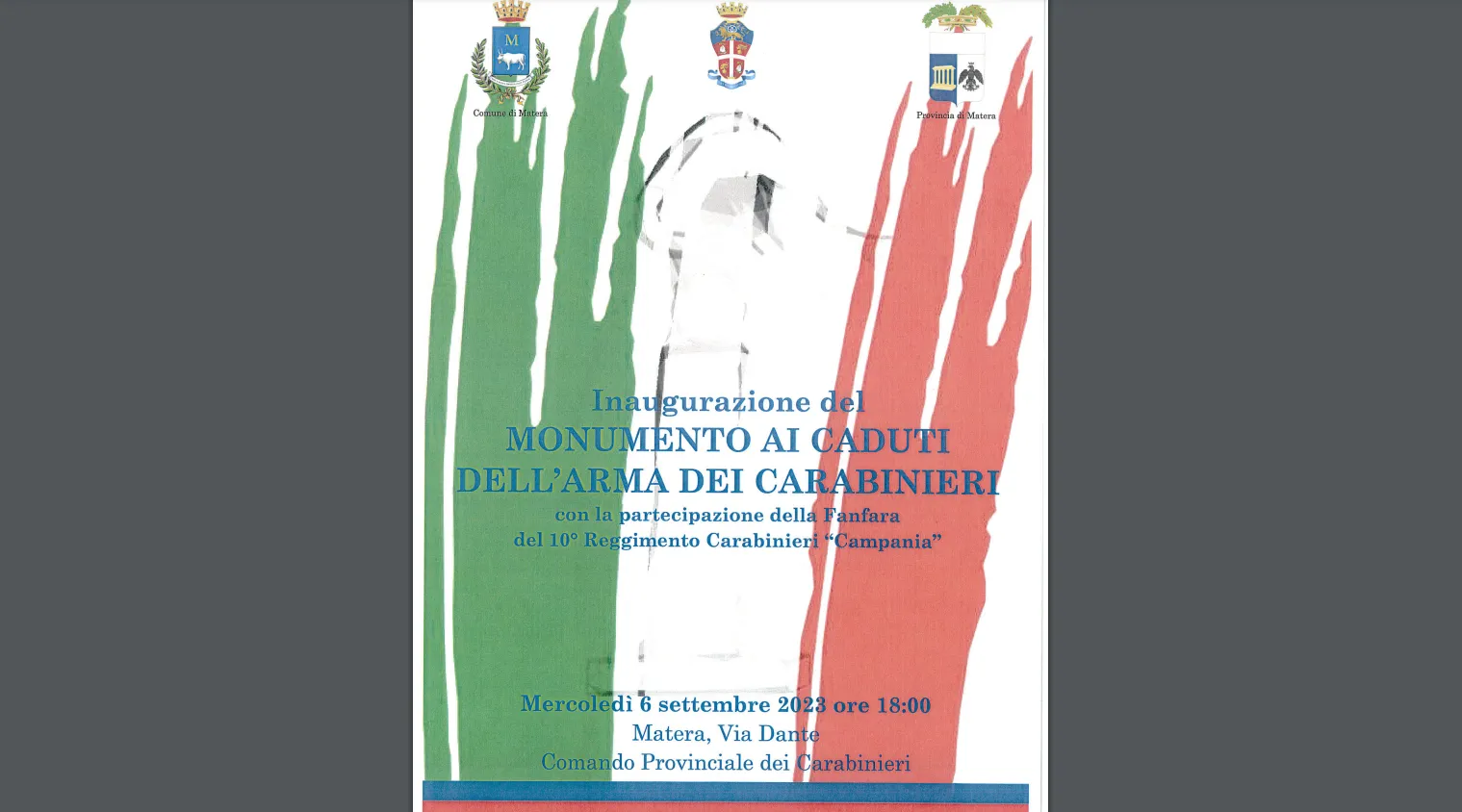 Sarà inaugurato oggi, mercoledì 6 settembre, alle 18 in via Dante, nella rotatoria antistante il Comando provinciale dei Carabinieri di Matera, il monumento ai Caduti dell’Arma dei Carabinieri, realizzato dall’artista Raffaele Pentasuglia. Interverranno il sindaco di Matera Domenico Bennardi, il presidente della Provincia di Matera Piero Marrese e il Comandante provinciale dell’Arma di Matera colonnello Nicola Roberto Lerario. Alla cerimonia parteciperà anche la Fanfara del 10° Reggimento Carabinieri Campania.