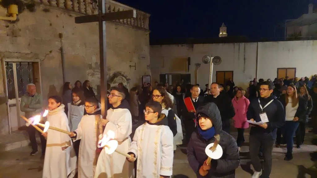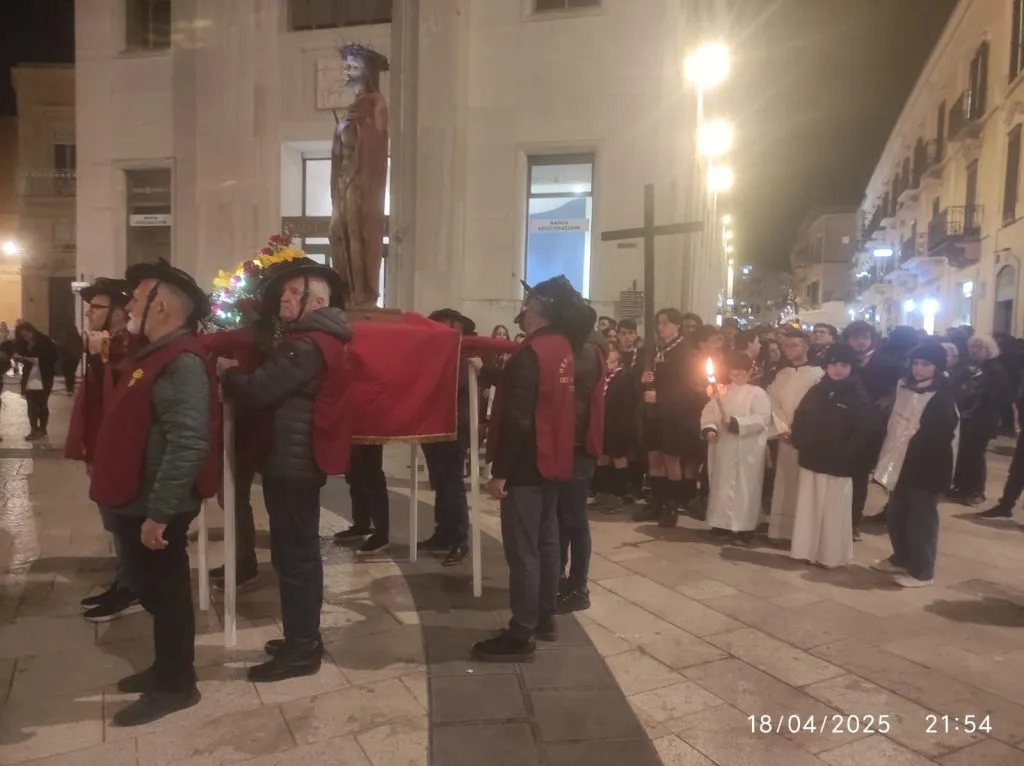 Accanto a don Francesco Gallipoli, che l’ha presieduta, si sono alternati diversi sacerdoti – don Pasquale Giordano, don Angelo Gallitelli, don Donato Di Cuia, don Donato Dell’Osso – che hanno animato le diverse stazioni con letture e preghiere, affiancati poi da alcuni lettori laici. Immancabile nell’animazione il canto di fra Gianparide Nappi ofm, oggi solo, ma che tutti conosciamo perché porta con la sua “Fratelli tutti band” la gioia di Cristo Signore nelle piazze della città.
