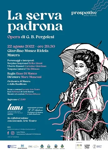 Questa sera, lunedì 22 agosto 2022 alle ore 20,30 nel Giardino del Museo Ridola a Matera è in programma l’intermezzo buffo “La serva padrona” di Gian Battista Pergolesi. Lo spettacolo è organizzato dall’Associazione Lucania Arte Teatro di Matera, dal Lams e dall’Associazione Culturale Rocco D’Ambrosio nell’ambito dei rispettivi cartelloni “XIV edizione Città dei Sassi Opera Festval” e “Prospettive Music Festival”.