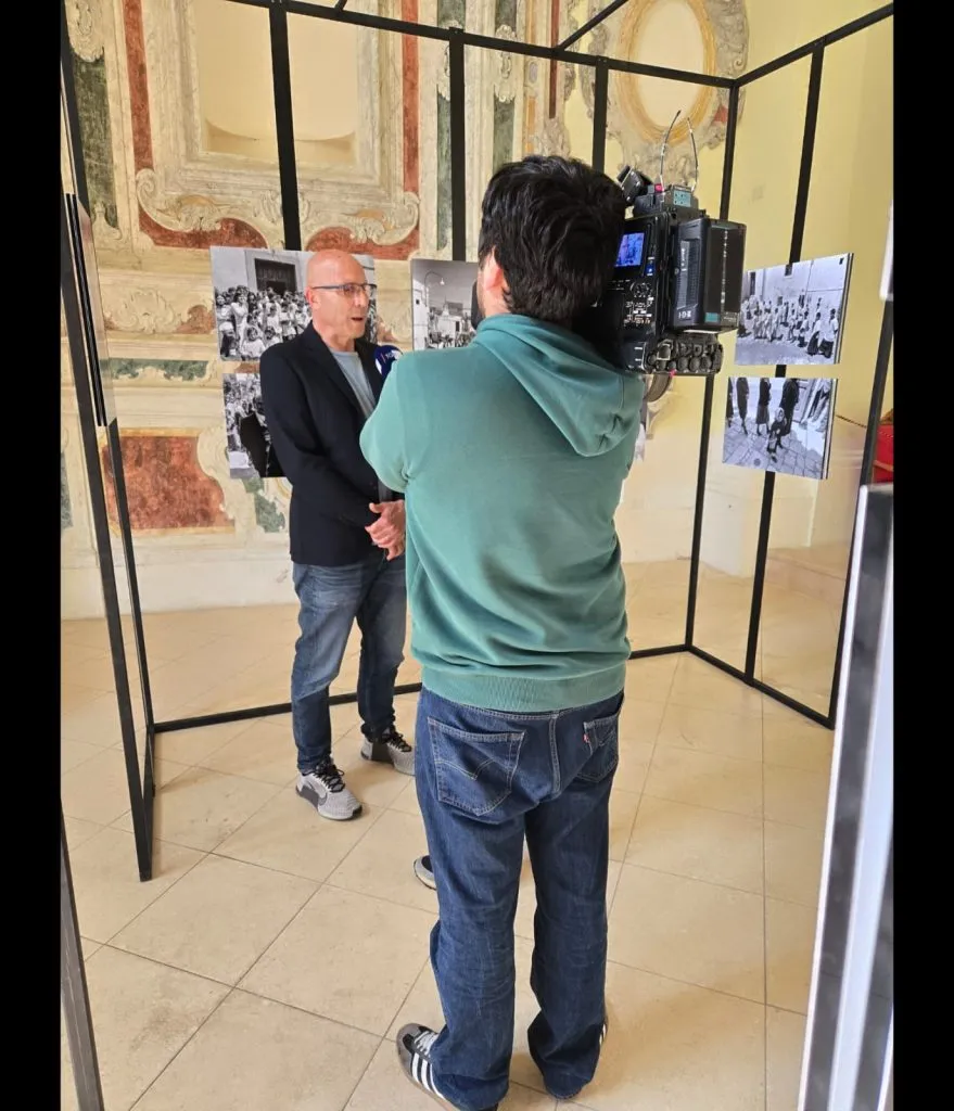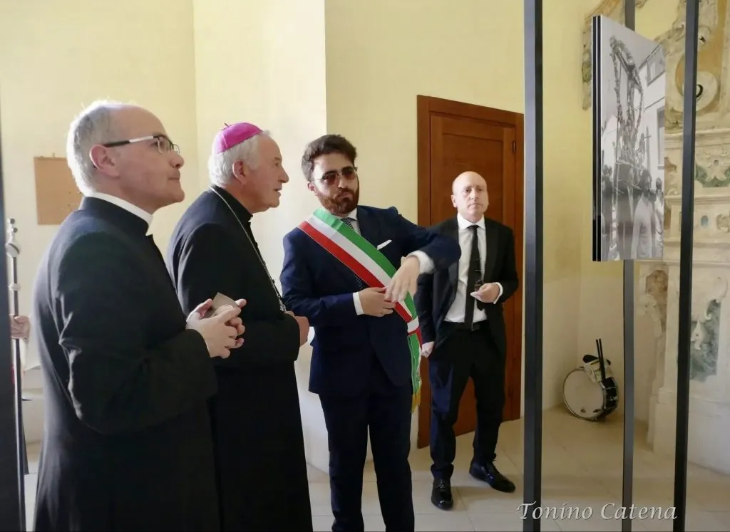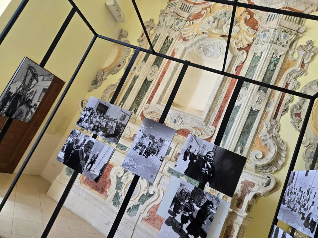 A qualificare ulteriormente la ricorrenza, due mostre distinte – entrambe coordinate con intelligenza curatoriale da Gabriele Scarcia, studioso di indiscussa finezza critica e profondo conoscitore della storia religiosa del territorio – le quali hanno saputo restituire al visitatore non solo immagini e oggetti, ma forme di pensiero e codici di devozione. La prima, inaugurata la sera del 2 maggio presso la chiesa della Madonna del Carmine, dal titolo “Il Volto della Devozione”, è stata dedicata agli scatti in bianco e nero realizzati nel 1978 da Mimì Notarangelo, testimone visivo della processione di un’epoca ormai distante, ma ancora perfettamente riconoscibile nei suoi tratti costitutivi. L’iniziativa è stata resa possibile grazie ai figli Giuseppe e Antonio, dall’Associazione Pier Paolo Pasolini di Matera, da Don Egidio Musillo, dall’Amministrazione comunale sempre attenta e presente la cui sensibilità ha permesso che tale esposizione potesse offrire al pubblico una mostra di alto livello. Le immagini proposte non sono state concepite come mera documentazione storica, bensì come un vero e proprio dispositivo di rivelazione del gesto devoto, del pathos rituale, dell’etica del sacro che caratterizza la pietà popolare di Miglionico.