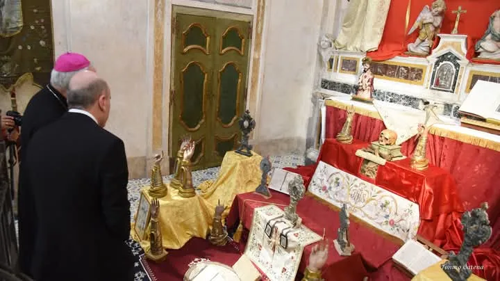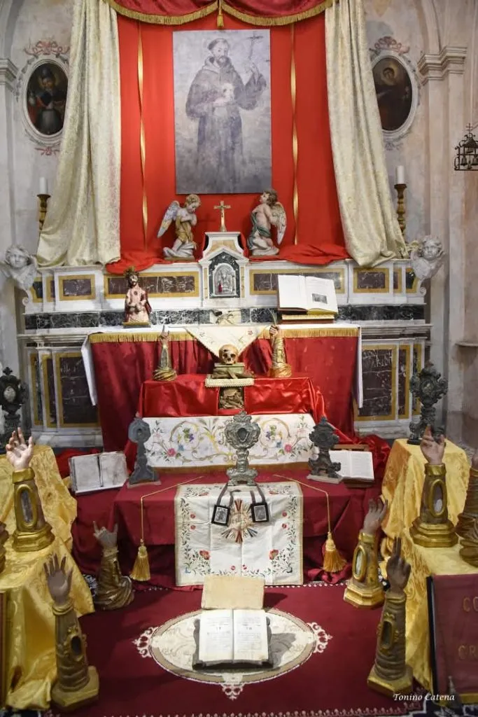 La seconda esposizione, invece, è stata allestita nella cappella del Patrono della chiesa madre di Santa Maria Maggiore e ha visto protagonisti alcuni pregevoli bracci reliquiario, testimoni silenziosi e materiali di una fede saldamente ancorata alla dimensione incarnata e concreta del culto. Curata anch’essa da Gabriele Scarcia, con la collaborazione fondamentale del priore della confraternita del Santissimo Crocifisso, Nino Comanda e di don Egidio, l’esposizione ha avuto il merito di riportare l’attenzione sull’aspetto tangibile della devozione, laddove l’oggetto liturgico diventa medium tra il fedele e il mistero, tra la corporeità e il trascendente. La sapiente disposizione delle reliquie e l’accuratezza della selezione hanno reso possibile una fruizione che non si limita all’ammirazione estetica, ma invita a una riflessione sul valore sacrale degli strumenti del culto, sulla loro funzione nella costruzione del sentimento religioso e sulla loro potenza simbolica all’interno dell’universo spirituale locale.