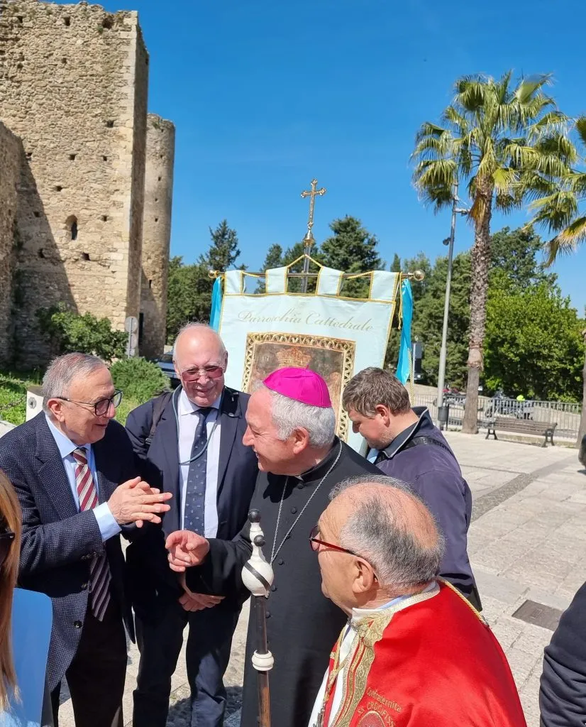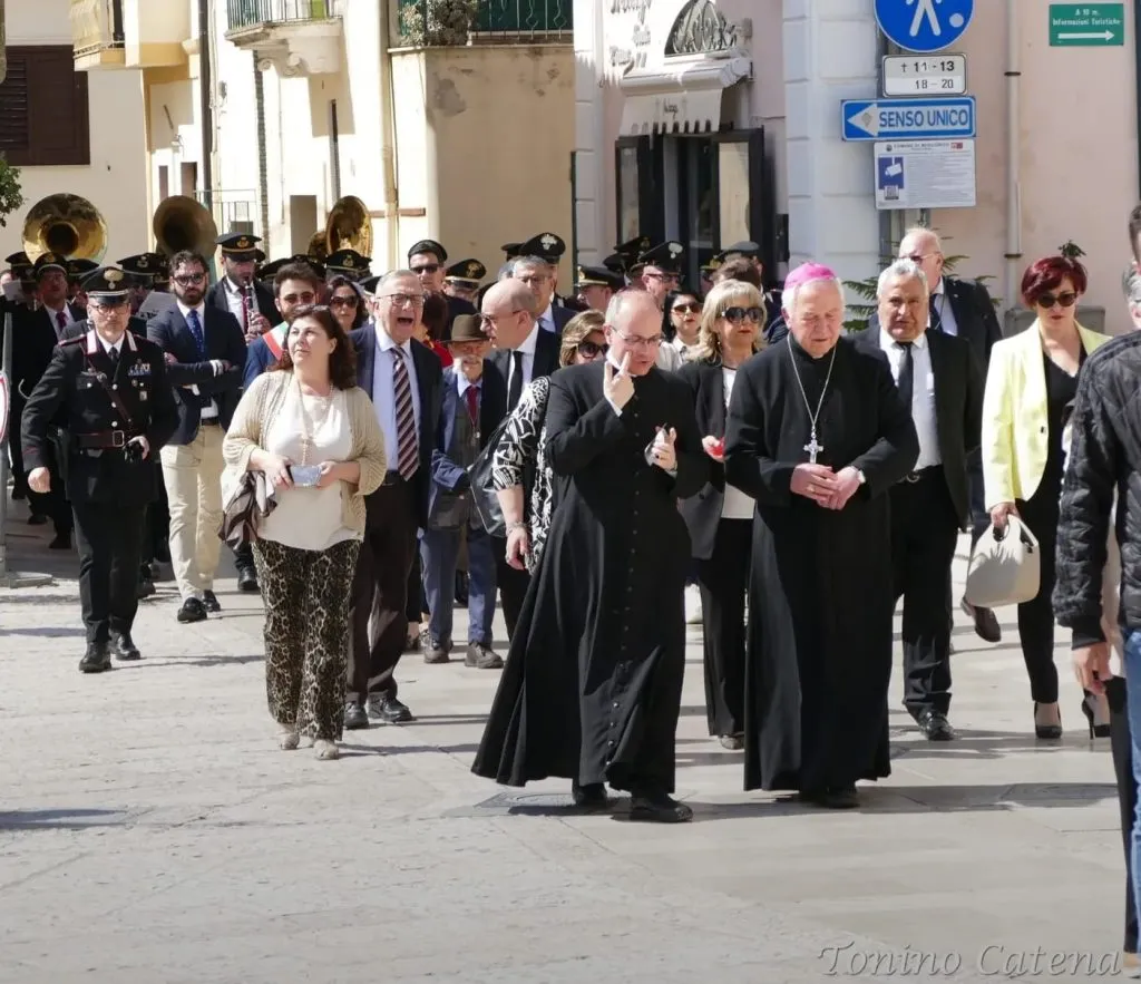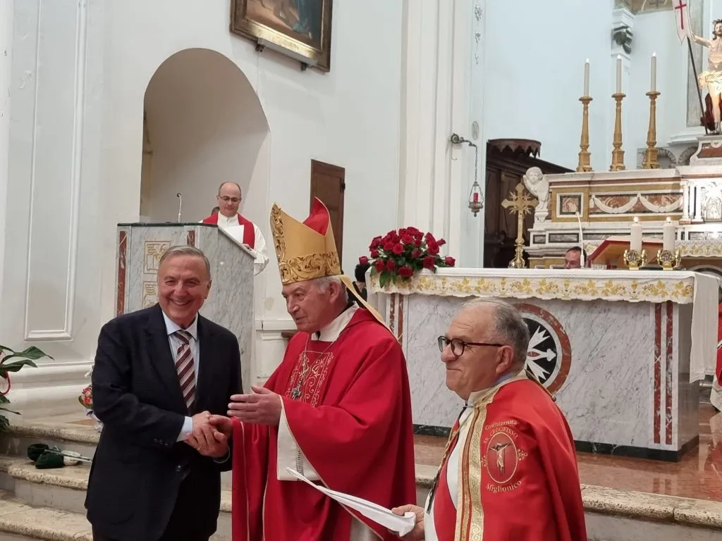 E proprio nella solenne Celebrazione le parole di Sua Eccellenza Monsignor Salvatore Ligorio si sono levate come sintesi alta e vibrante del senso profondo della devozione al Crocifisso, tracciando con sapienza pastorale un orizzonte di riflessione che ha saputo congiungere teologia e vita. Con voce pacata, ma ferma, l’Arcivescovo emerito ha richiamato i presenti alla necessità di tornare all’essenziale, a quella radice del Vangelo che è dialogo, accoglienza, ascolto sincero, spirito di unità. Ha affermato con lucidità evangelica che l’amore, quello vero, incarnato, crocifisso e risorto, vince ogni cosa, ogni divisione, ogni paura, ogni barriera. Nel cuore dell’omelia ha elevato un pensiero speciale agli anziani, ai poveri, a coloro che vivono il dolore in silenzio, a quanti, spesso invisibili al mondo, sono invece intimamente legati alla figura del Cristo crocifisso e in lui trovano non solo consolazione, ma dignità. Ha esortato la comunità a contemplare la Croce non come simbolo di rassegnazione, bensì come chiamata alla testimonianza, alla solidarietà, alla dedizione generosa. “Dobbiamo osservare – ha detto – la vita di Cristo nella sua sofferenza e farne dono agli altri”, perché in quell’offerta redentrice si manifesta la bellezza più autentica: quella che nasce dalla ferita, quella che splende nell’oscurità, quella che si fa carezza sulle piaghe del mondo.